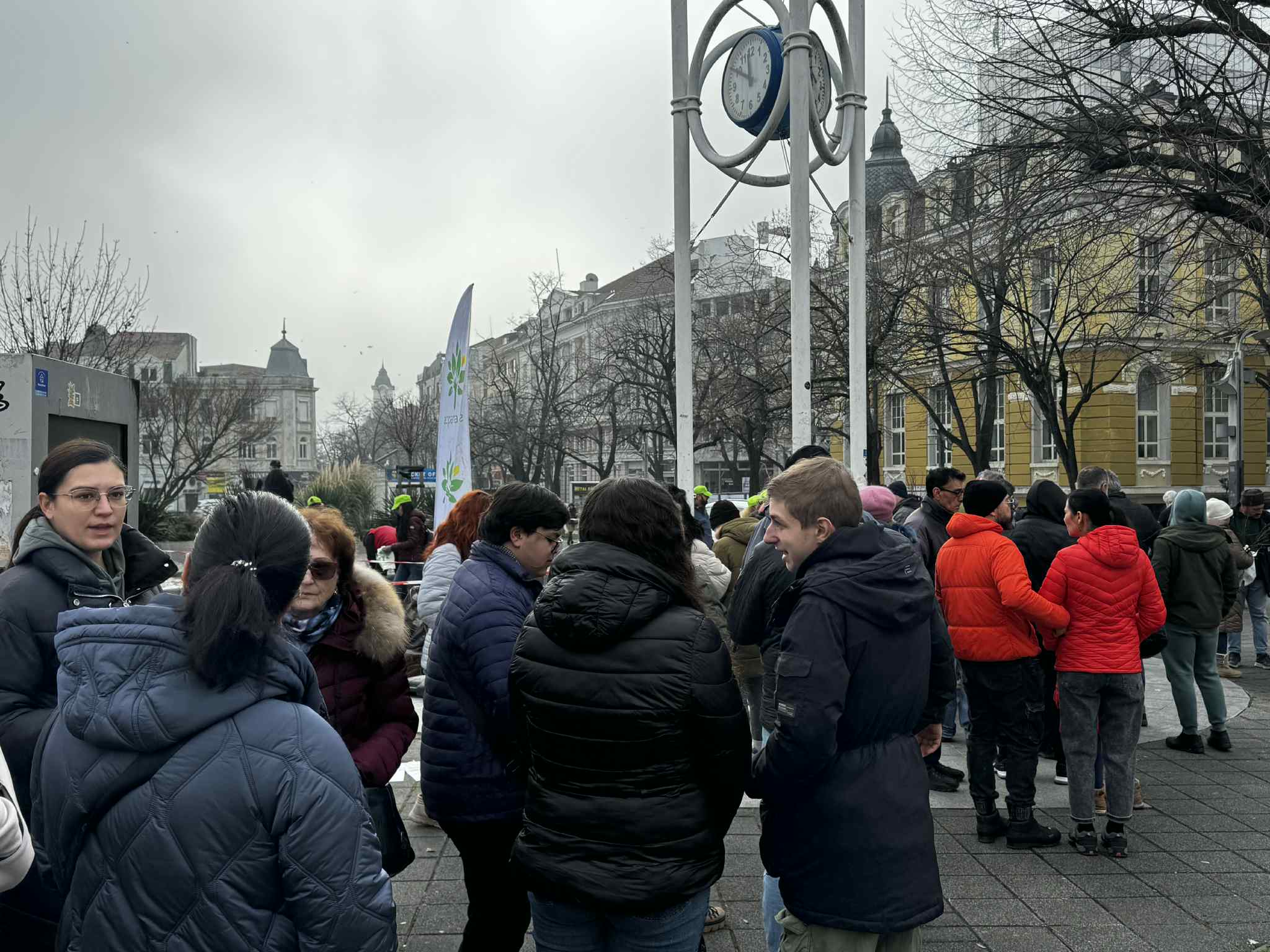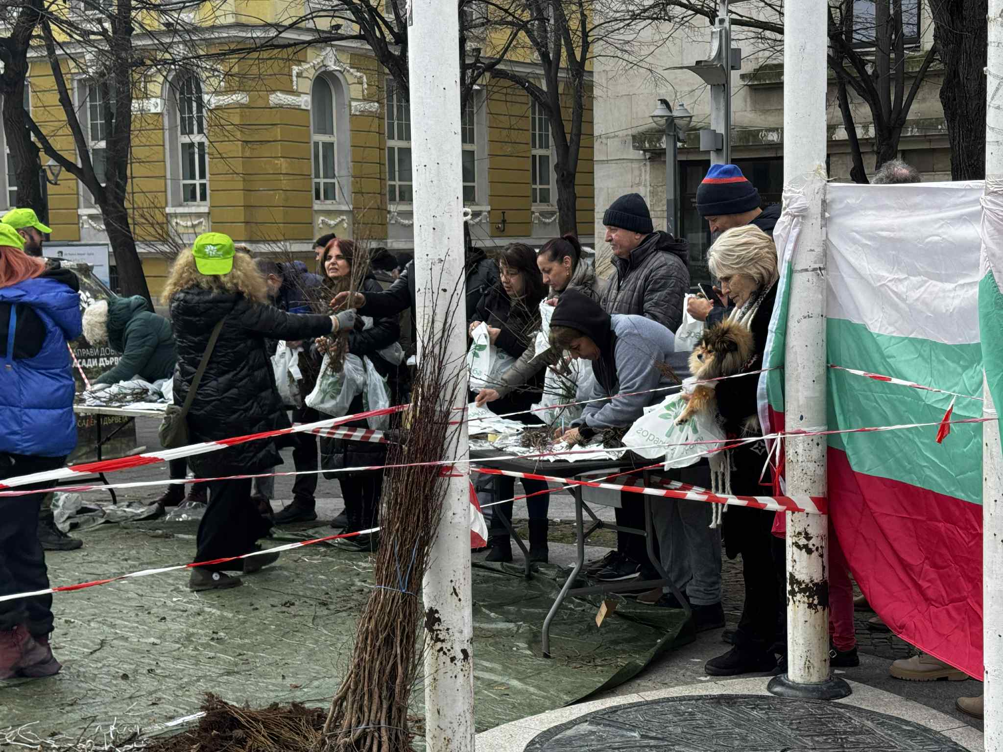 Около 11 часа пространството до Часовника, където бе позициониран пунктът за раздаване се изпълни с хора, дошли да получат фиданка, която да засадят пред дома си.