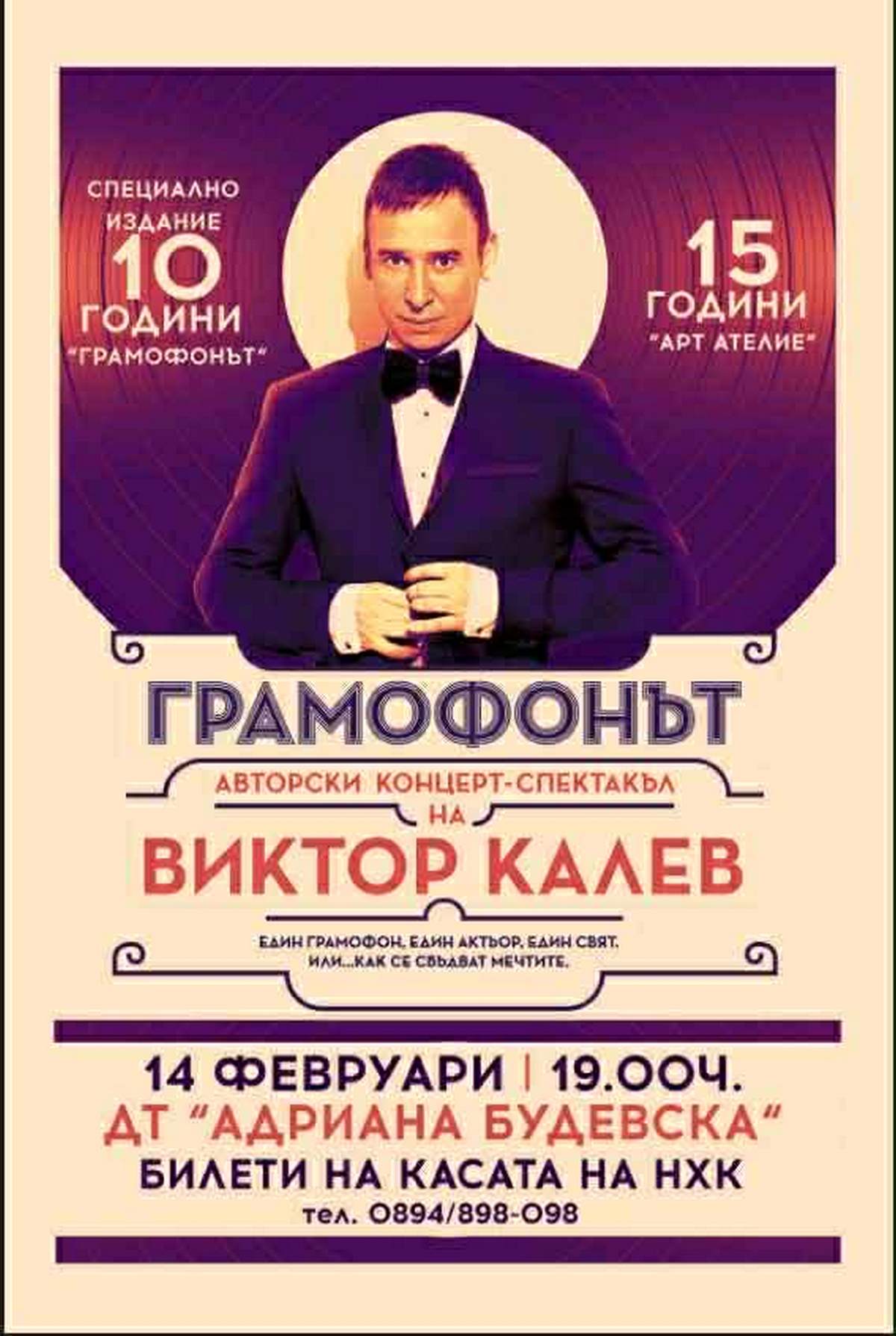 Продуцентска къща „Ажур Пико“ и културна организация Арт ателие 77 представят авторския концерт-спектакъл „Грамофонът“ на Виктор Калев. Представлението ще се състои на 14 февруари в Драматичен театър Адриана Будевска и ще бъде специално посветено на празника на любовта.