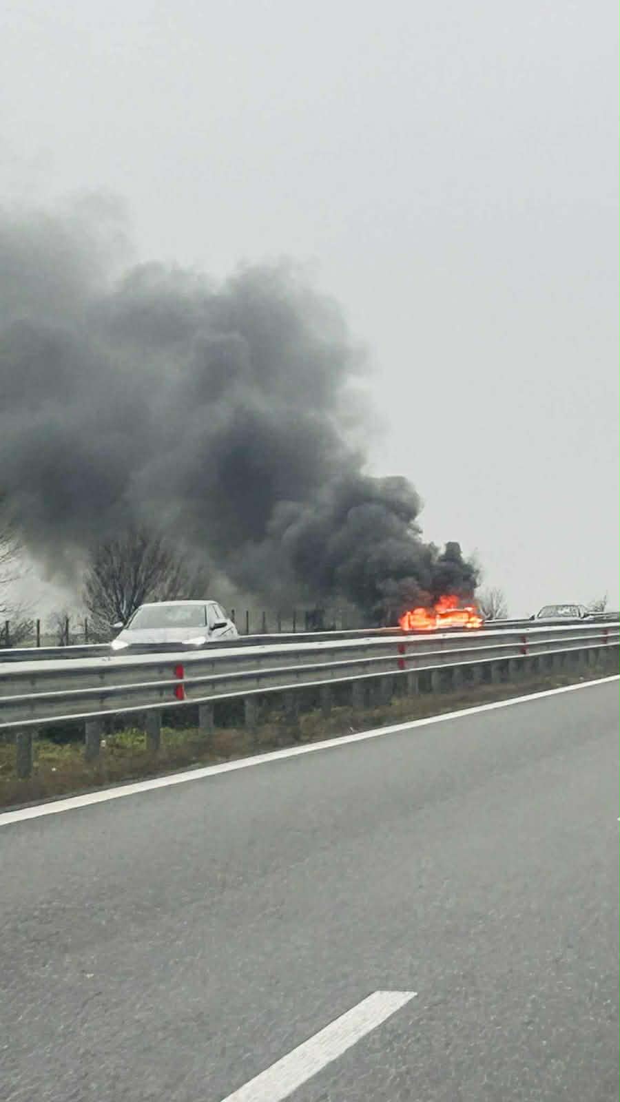 На място все още няма пристигнали екипи на пожарната. Движението в участъка е затруднено, като водачите намаляват рязко скоростта заради ограничената видимост и риска от допълнителни инциденти. Очевидци съобщават, че пламъците са обхванали голяма част от автомобила само минути след като е спрял в аварийната лента.