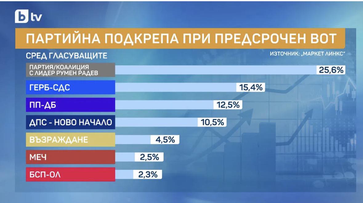 Маркет линкс: Румен Радев е първа политическа сила с 25,6 %, ще има само 5 партии в следващото НС