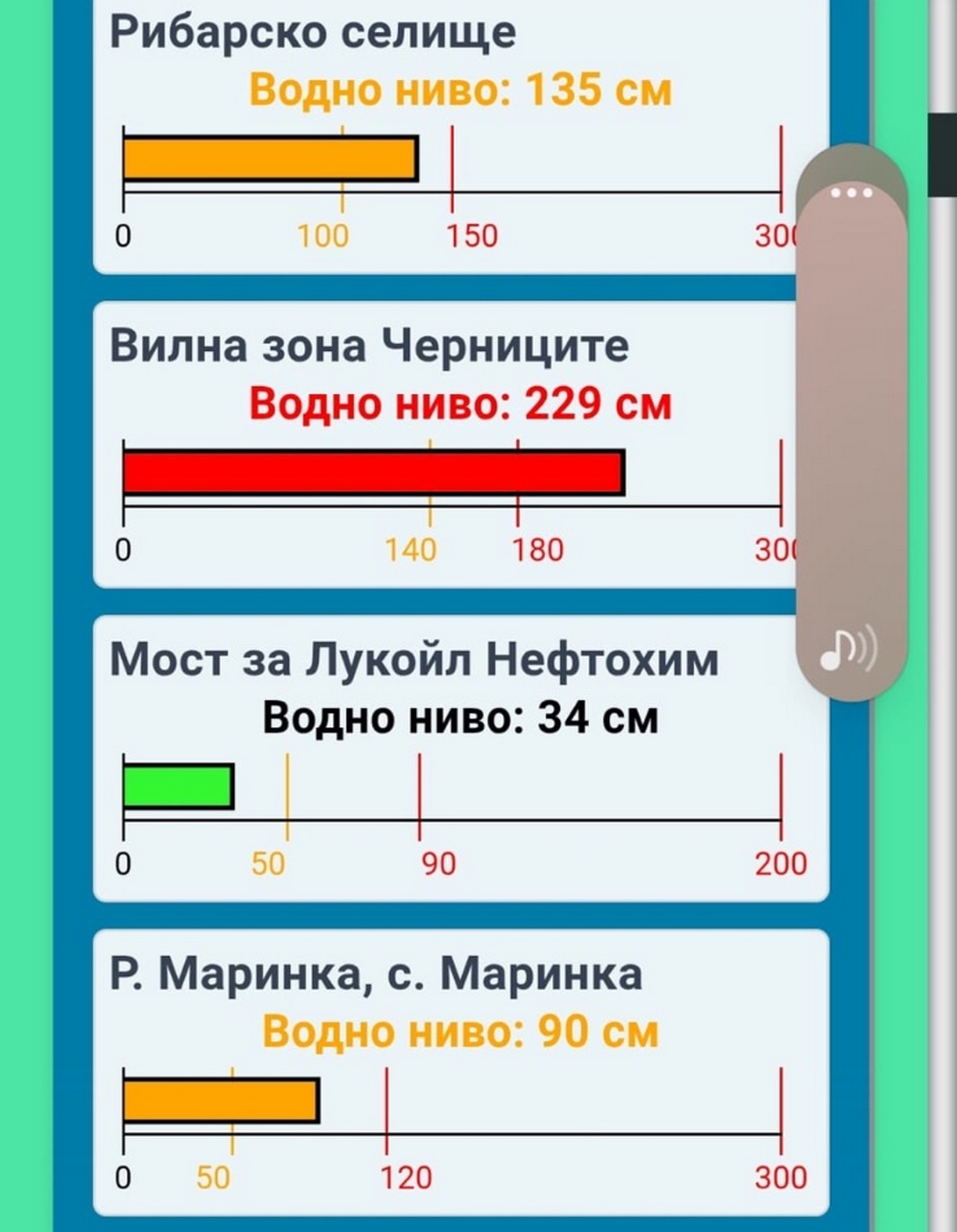 Данните от системата за наблюдение на водните нива в община Бургас показват повишени стойности на някои критични точки. Във вилна зона „Черниците“ водното ниво достига 229–230 см, което е в червената зона и изисква засилен мониторинг. В района на Рибарско селище нивото е 135 см – в повишен, но не критичен диапазон. Река Маринка при с. Маринка отчита между 81 и 90 см, а в Долно Езерово нивото е около 33–35 см.