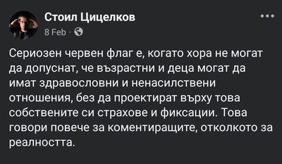 Сериозен червен флаг е, когато хора не могат да допуснат, че възрастни и деца могат да имат здравословни и ненасилствени отношения, без да проектират върху това собствените си страхове и фиксации. Това говори повече за коментиращите, отколкото за реалността.