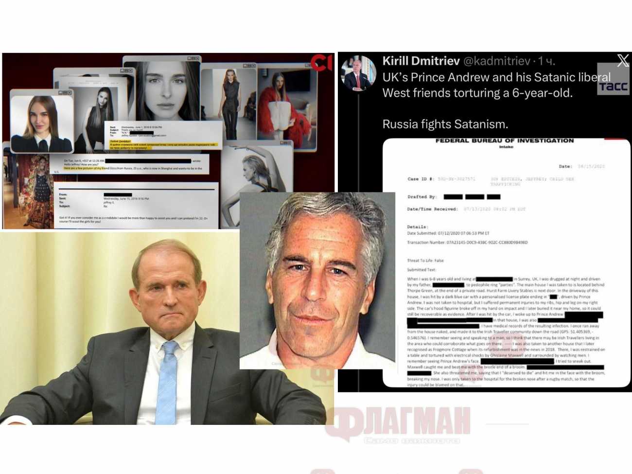 „Между другото, украинската връзка в случая с Епщайн е повече от достатъчна. През 2008 г. фондация, контролирана от Джефри Епщайн – Gratitude America Ltd. – превежда 1 милион долара на фондация „Клинтън“. А тези средства са определени като дарение от Виктор Пинчук. Плащането е обработено чрез банковата сметка на фондацията на Епщайн“, обяснява Медедчук.