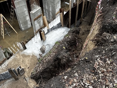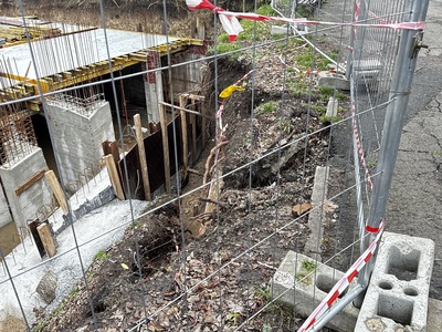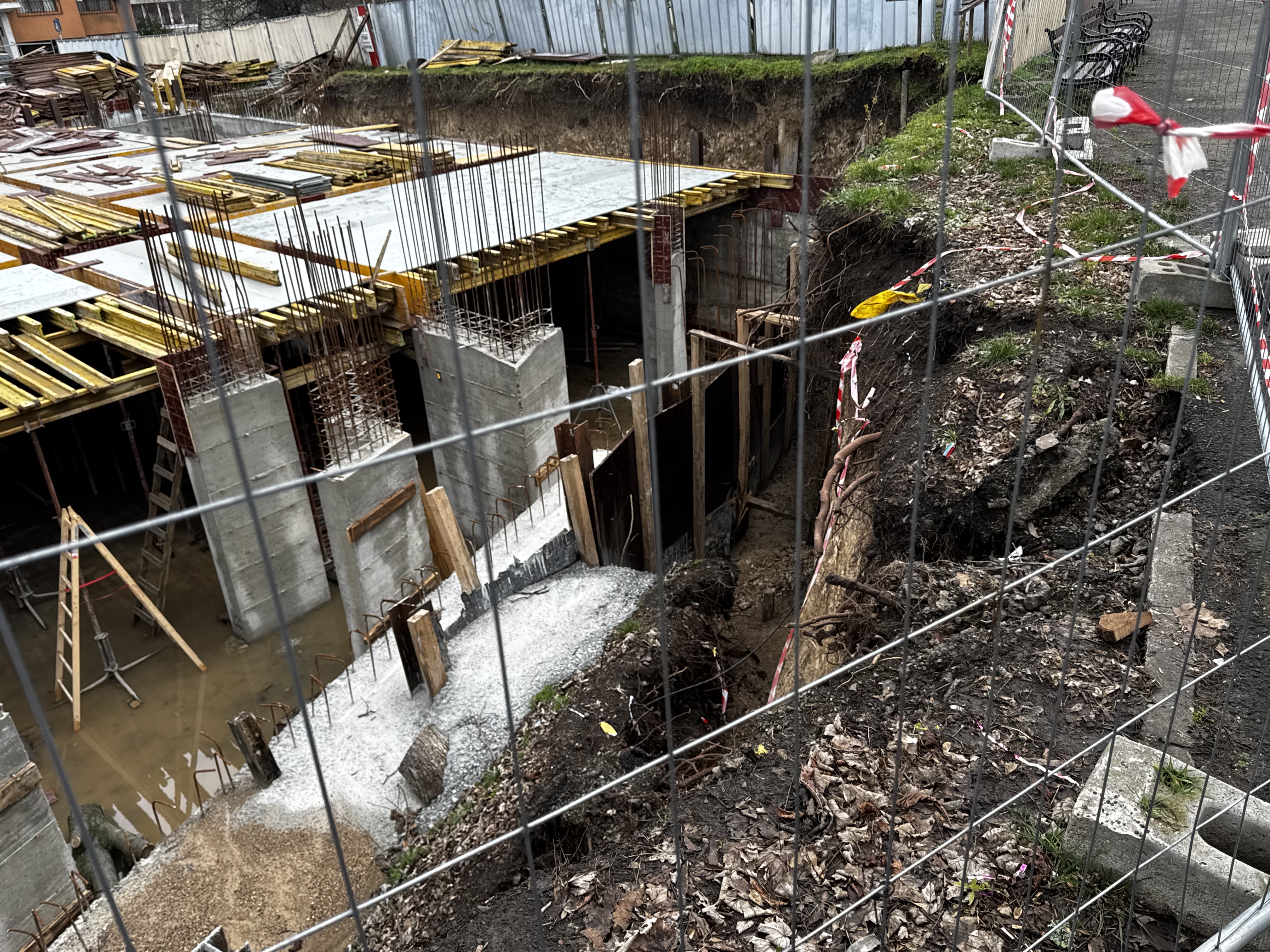 При проверка на място от наш екип се виждат участъци с пропаднала почва и свлечени земни маси на метри от строителното съоръжение. Част от пешеходната алея също показва признаци на компрометиране, което създава риск от допълнително срутване при неблагоприятни условия или продължаващи изкопни работи.