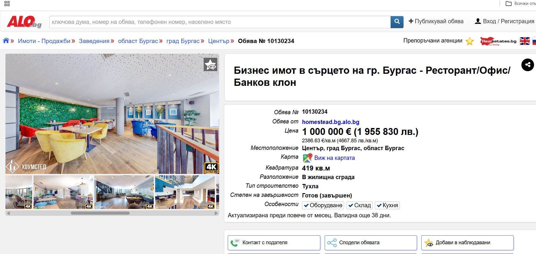 Имотът, познат на по-старото поколение бургазлии като култовия „Силвър клуб“, е с чиста площ от 314 кв. м, разпределени на две нива. В обявата е посочено, че пространството е подходящо не само за ресторант, но и за офис, адвокатска кантора, банков клон или представителство на международна компания. По последна информация собственик на обекта е бизнесменът Сава Чоролеев.
