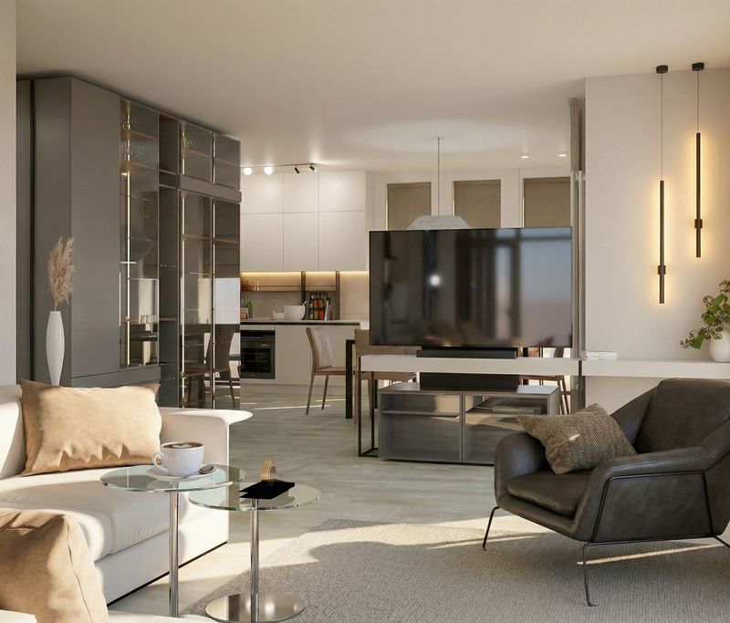 На партерното ниво е организирана дневната зона в open-plan схема с ясно диференцирани функционални подзони. Високите тавани и витринните остъклявания с пълна височина осигуряват дълбоки визуални перспективи към вътрешния двор и павилиона за гости, като същевременно гарантират оптимално дневно осветление и визуална връзка с ландшафта.