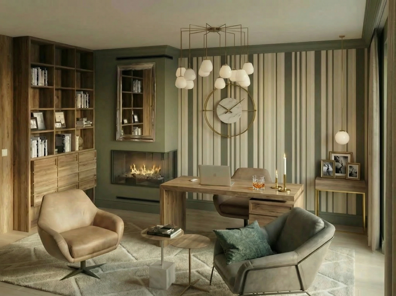 Домашният кабинет комбинира дърво, камина и вертикален ритъм в стенните панели. Пространството носи концентрация и стабилност. Тук дизайнът служи на функцията.