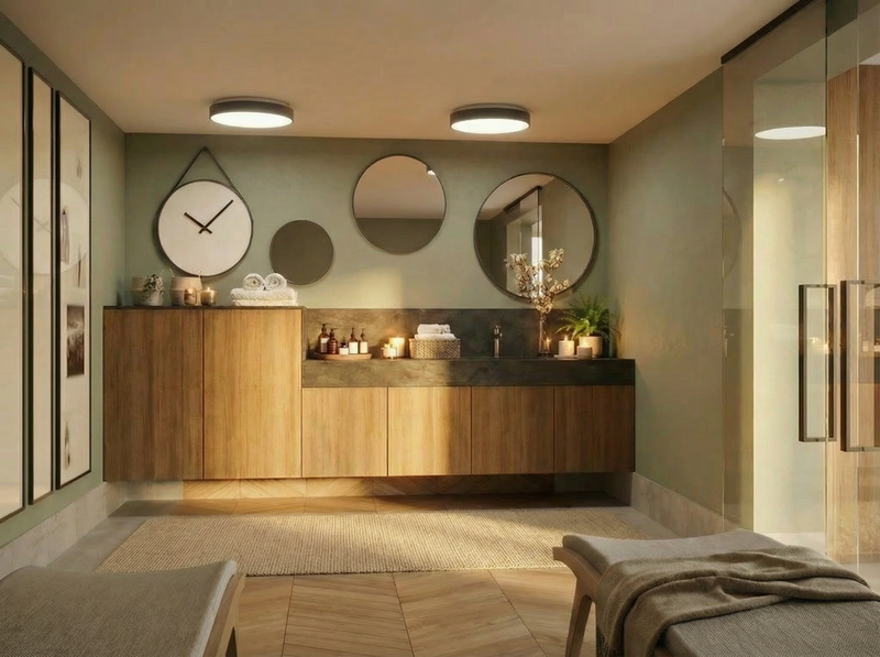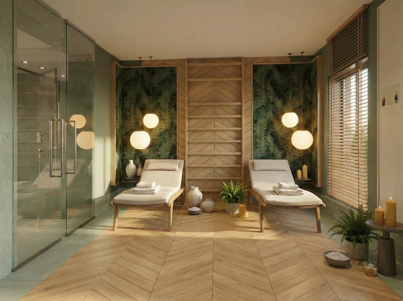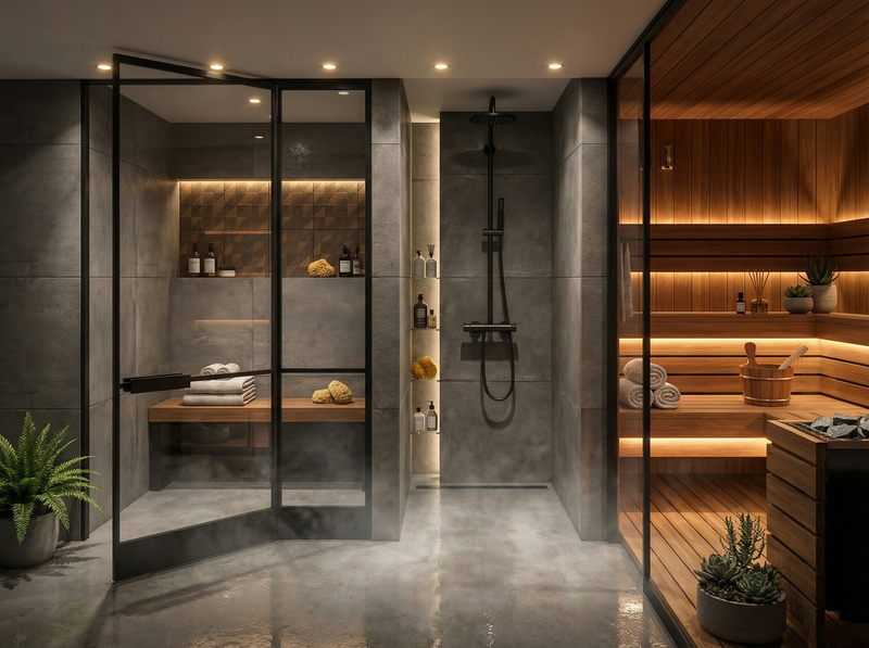 СПА центърът е проектиран като самостоятелен свят. Релакс зоната е отделена концептуално от останалите помещения. Стъклените прегради, бетонната текстура и топлата дървесина в сауната изграждат контраст, който усилва усещането за уединение. Осветлението е скрито и дифузно. Материалите са подбрани така, че да създадат контролирана и тиха атмосфера. Това пространство не е допълнение към къщата. То е нейният завършек.