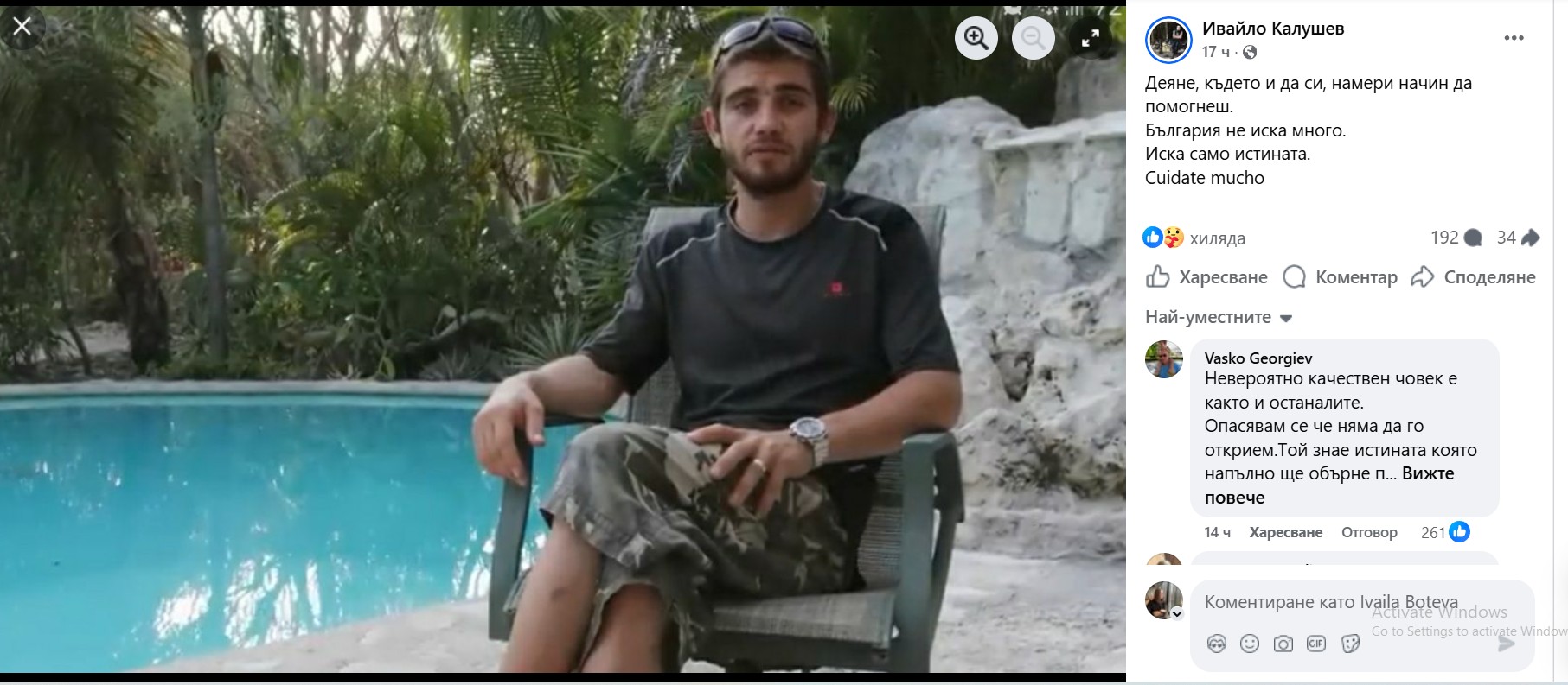 Последното публикувано съобщение е адресирано към Деян Илиев – Мексиканеца, човекът, открил телата в района на хижа „Петрохан“. В него се казва: „Деяне, където и да си, намери начин да помогнеш.