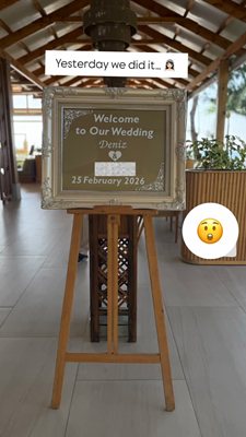 Малко след това тя публикува кадър с табела „Welcome to Our Wedding Deniz & … 25 February 2026″, което ясно подсказва, че става дума именно за сватба. В следващите снимки се вижда и романтична церемония сред палми и цветя, а самата Дениз е в булчинска визия до своя избраник.