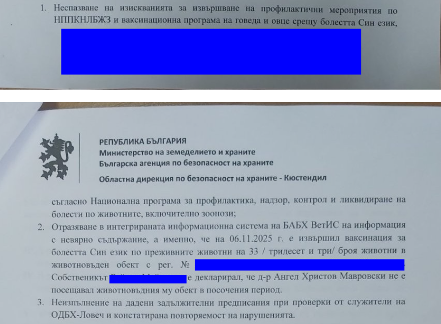 Сочи се, че заличаването е извършено със заповед на директора на Областната дирекция по безопасност на храните - Кюстендил от 14 ноември 2025 г., издадена на основание Закона за ветеринарномедицинската дейност след проверки на Областната дирекция по безопасност на храните - Ловеч.