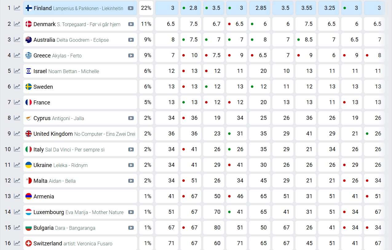 Тази година картината е ясна: засега първа при букмейкърите е Финландия с песента на финландски език – „Liekinheitin“ („Огнемет“), изпълнена от Линда Лампениус и Пете Парконен. Шансовете ѝ възлизат на около 22 %, значително повече от всички останали. Това говори, че ако сред малкото други страни, които все още не са избрали своя песен, не се появи нещо по-интересно, тя и ще победи. Второто място букмейкърите отреждат на Дания с песента на датски език „Før vi går hjem“ („Преди да си тръгнем“), изпълнена от Сьорен Торпегаард Лунд. Следват Австралия, Гърция и Израел.