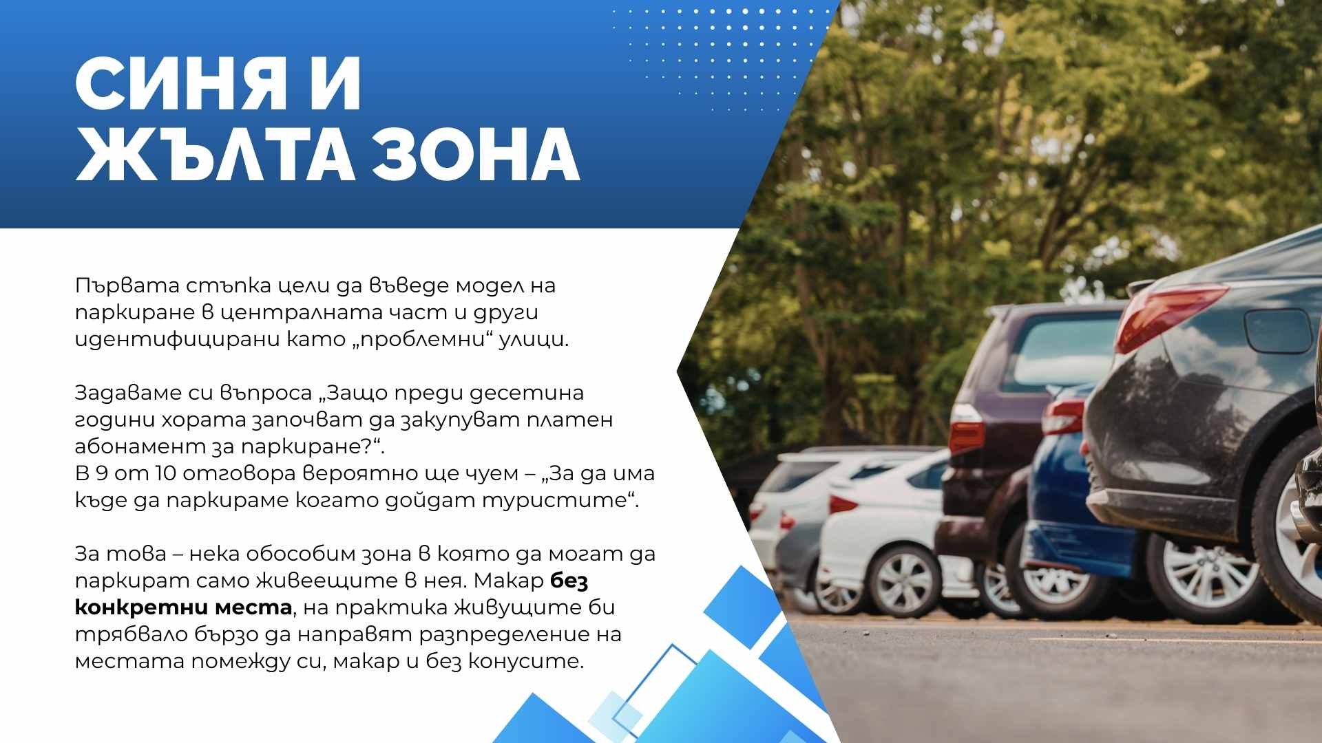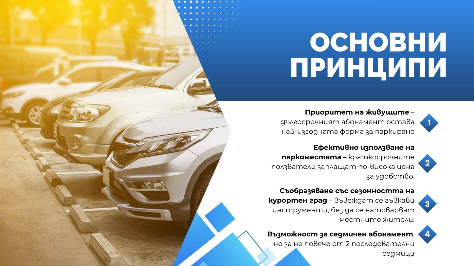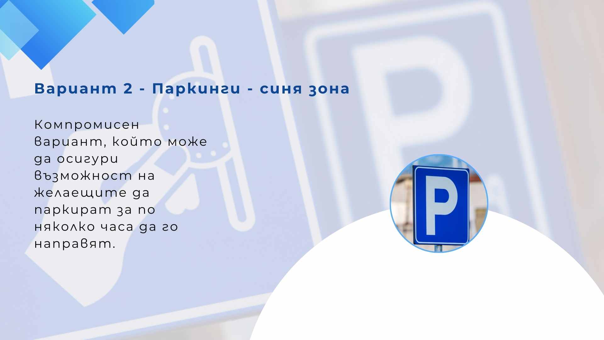 Основната цел на предложението е да се намали напрежението около паркирането, да се осигури възможност за кратковременно паркиране в централните части на града и да се използват по-ефективно съществуващите паркоместа.