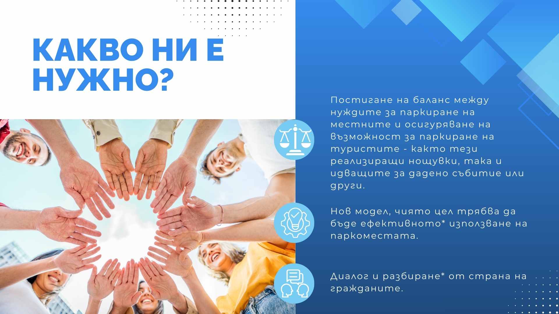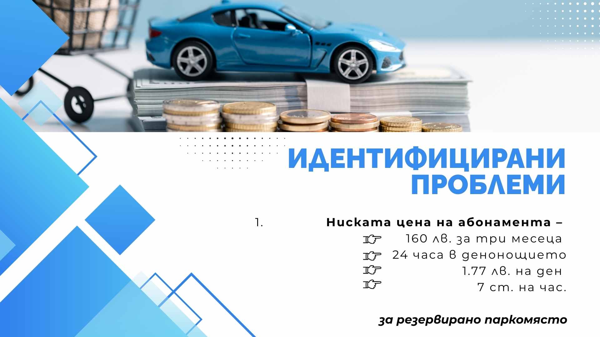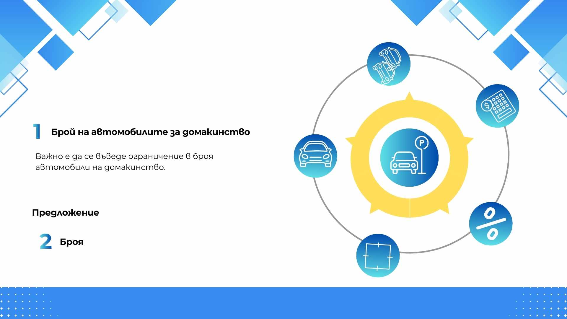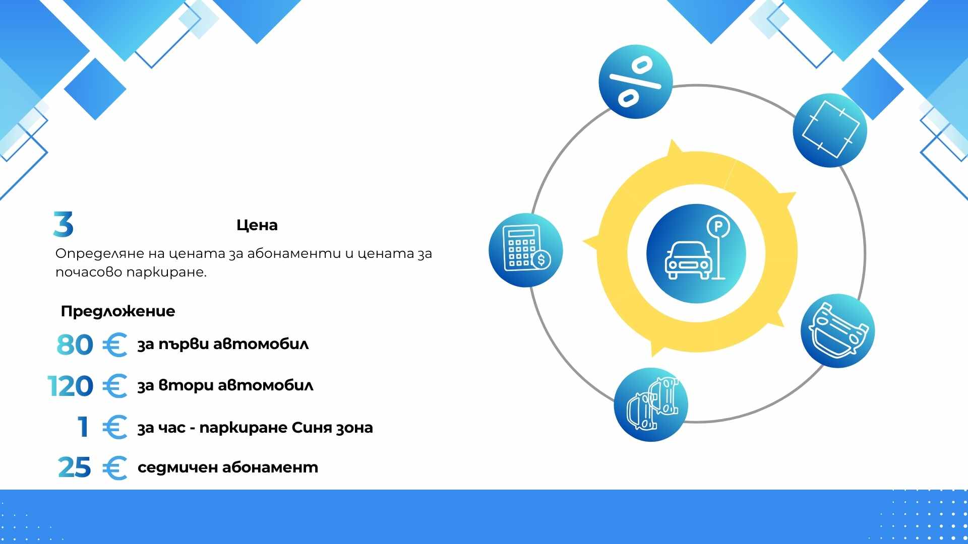 Основната цел на предложението е да се намали напрежението около паркирането, да се осигури възможност за кратковременно паркиране в централните части на града и да се използват по-ефективно съществуващите паркоместа.