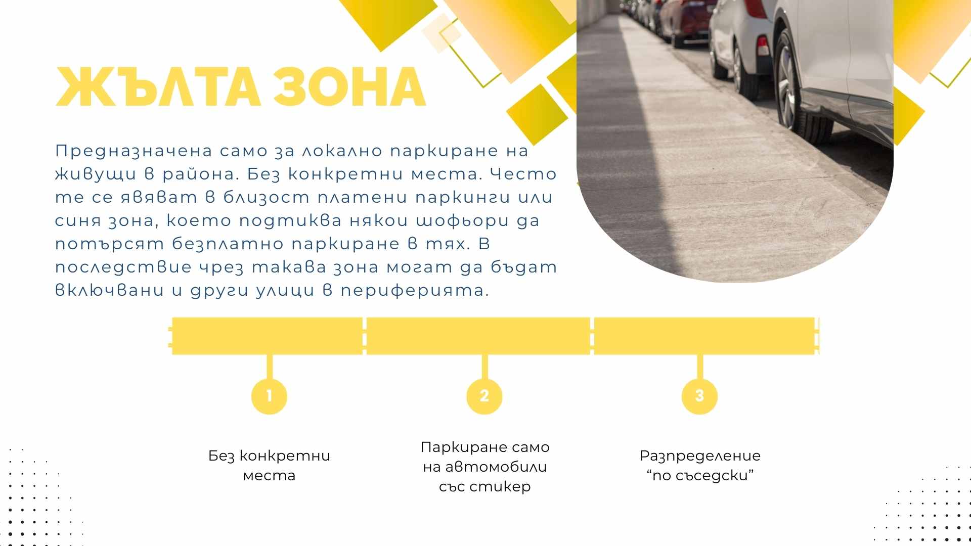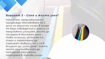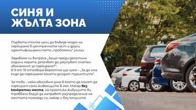 Идеята предвижда въвеждането на синя зона – за кратковременно паркиране в централната градска част и по-натоварени улици, с което ще се осигури възможност за закупуване на абонамент от живущите в съответния район.Ще има и жълта зона – за локално паркиране в периферията. И в двата случая абонаментът не гарантира конкретно паркомясто.