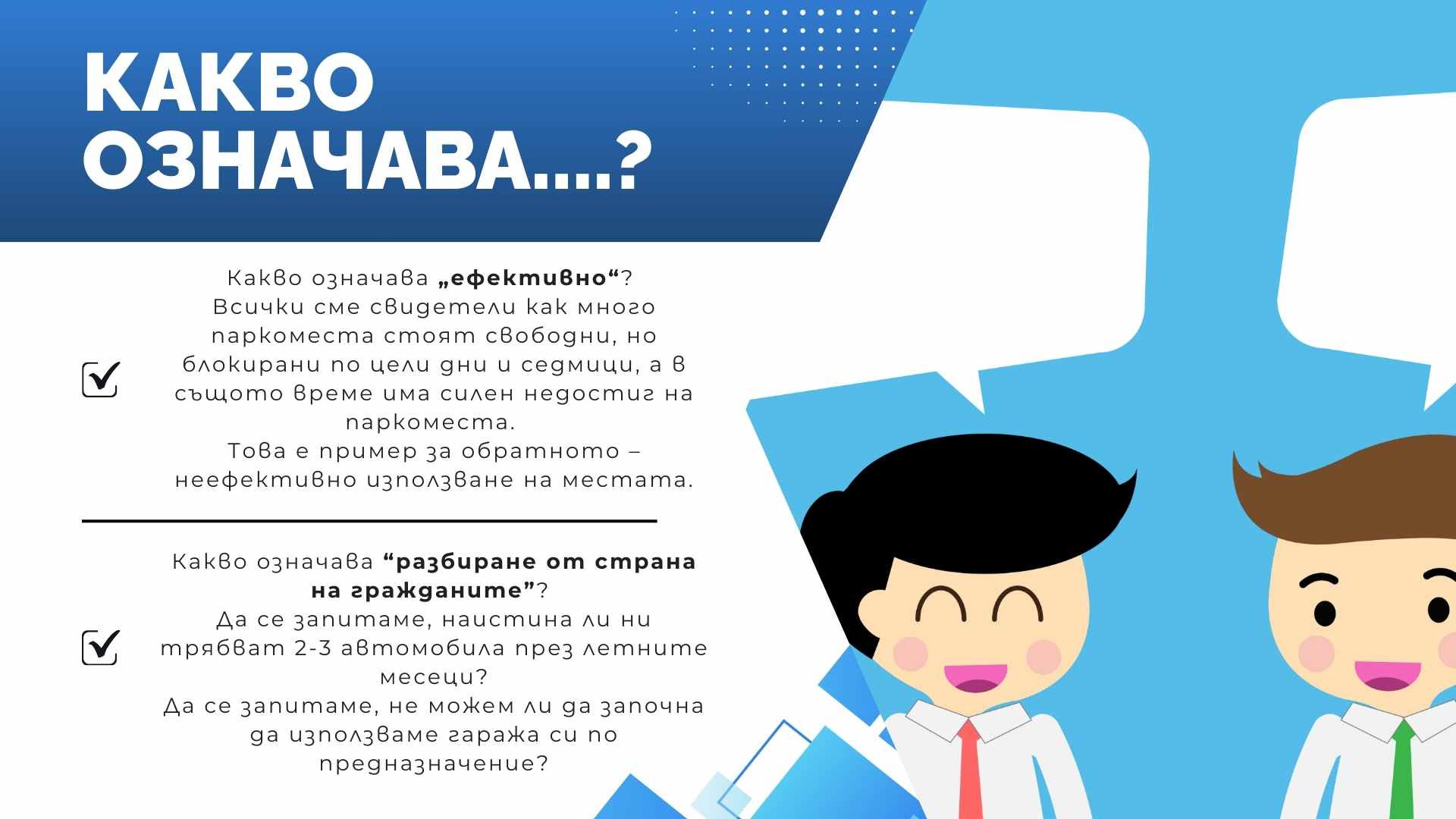 „Не въвеждаме нови правила, а представяме концепция за обществено обсъждане. Апелирам към уважение на този открит подход. Да не го наводняваме с безмислени предложения или спекулации, че се въвежда скъпа синя зона и т.н. Да не го обръщаме на разговор Общината предлага, ние трябва да сме против просто така“, каза кметът Марин Киров.