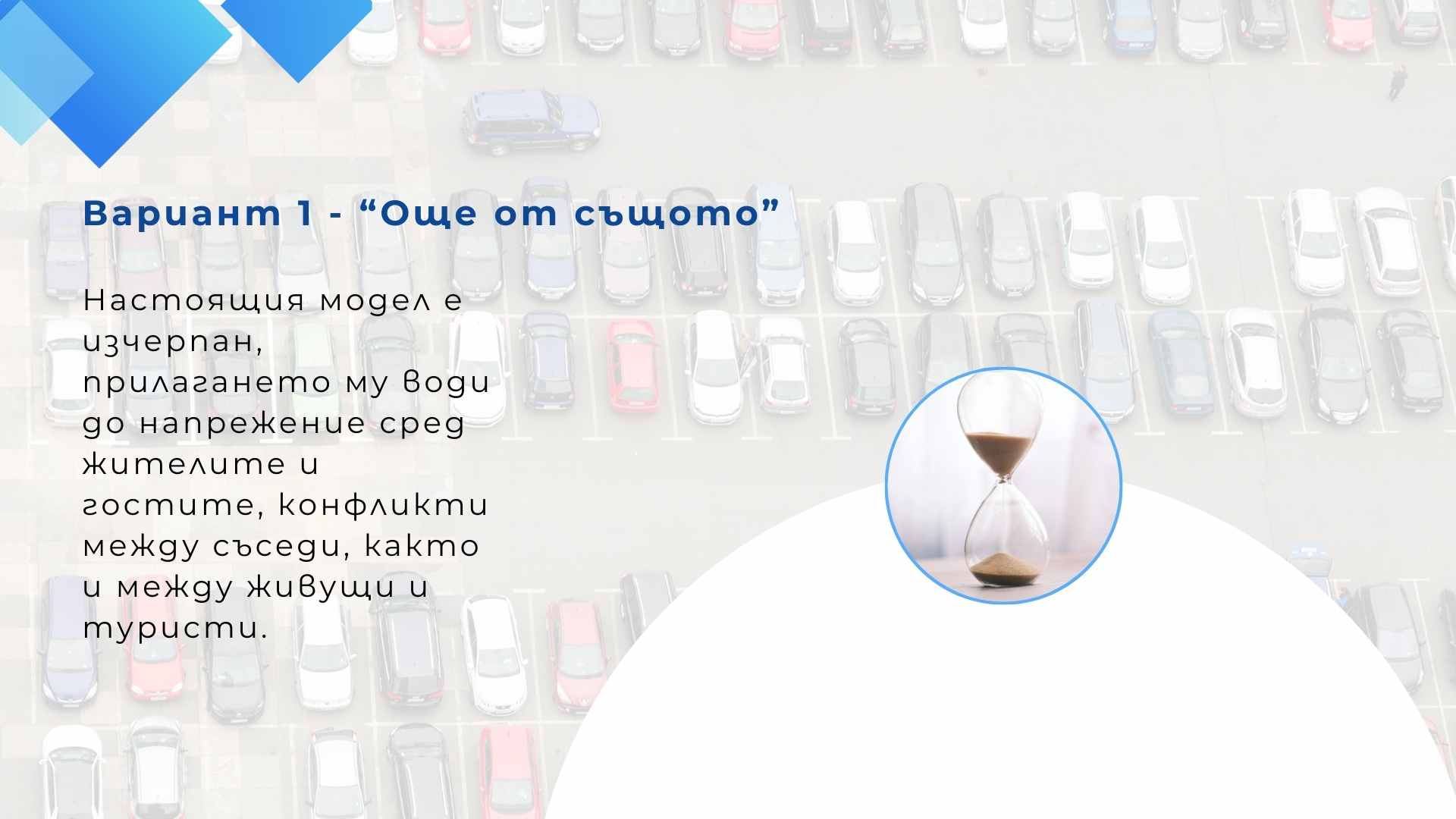 Ако предложението на администрацията не бъде приет от обществеността, ще продължи старият модел - с един безплатен буферен паркинг в града, няколко платени паркинга, стопанисвани от фирма, конуси и опит за по-голям контрол във всички населени места.