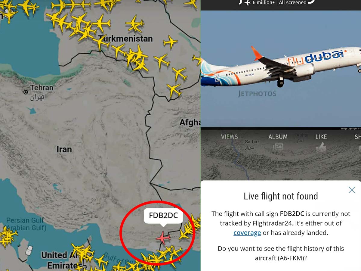 Дубайски самолет, преминал „напряко” през южната част на Иран, преди минути изчезна от живото предаване на Flightradar, показа справка в платформата. Става въпрос за полет FBD2DC на “FlyDubai”, който около 11:40 ч. българско време е прекосил въздушната граница между Пакистан и Иран в посока Обединените арабски емирства. Касае се за Боинг 737 МАX 8 - модел, който бе спрян от употреба времено през 2019 г. след няколко фатални инцидента от предходните години.
