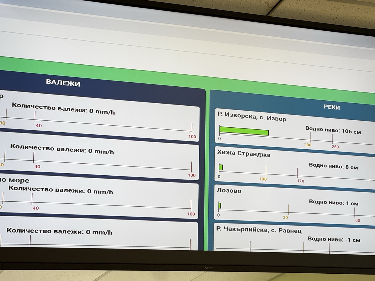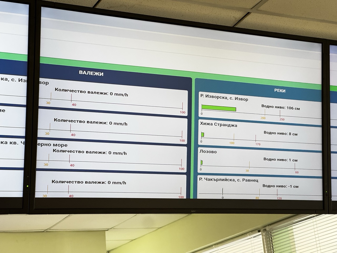 В контролната зала 24 часа в денонощието се следят количеството на валежите, реките, язовирите и още редица показатели, които дават възможност за бърза реакция при опасност от наводнения
