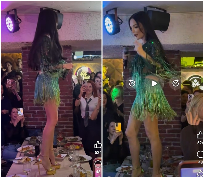 Облечена в ефектна рокля на ресни, която се люлееше в ритъма на музиката, звездата се развихри без никакъв свян. Певицата се мяташе по масата, размахваше коси и превърна заведението в истинска поп фолк сцена, каквато рядко се вижда дори в най-яките чалга клубове.