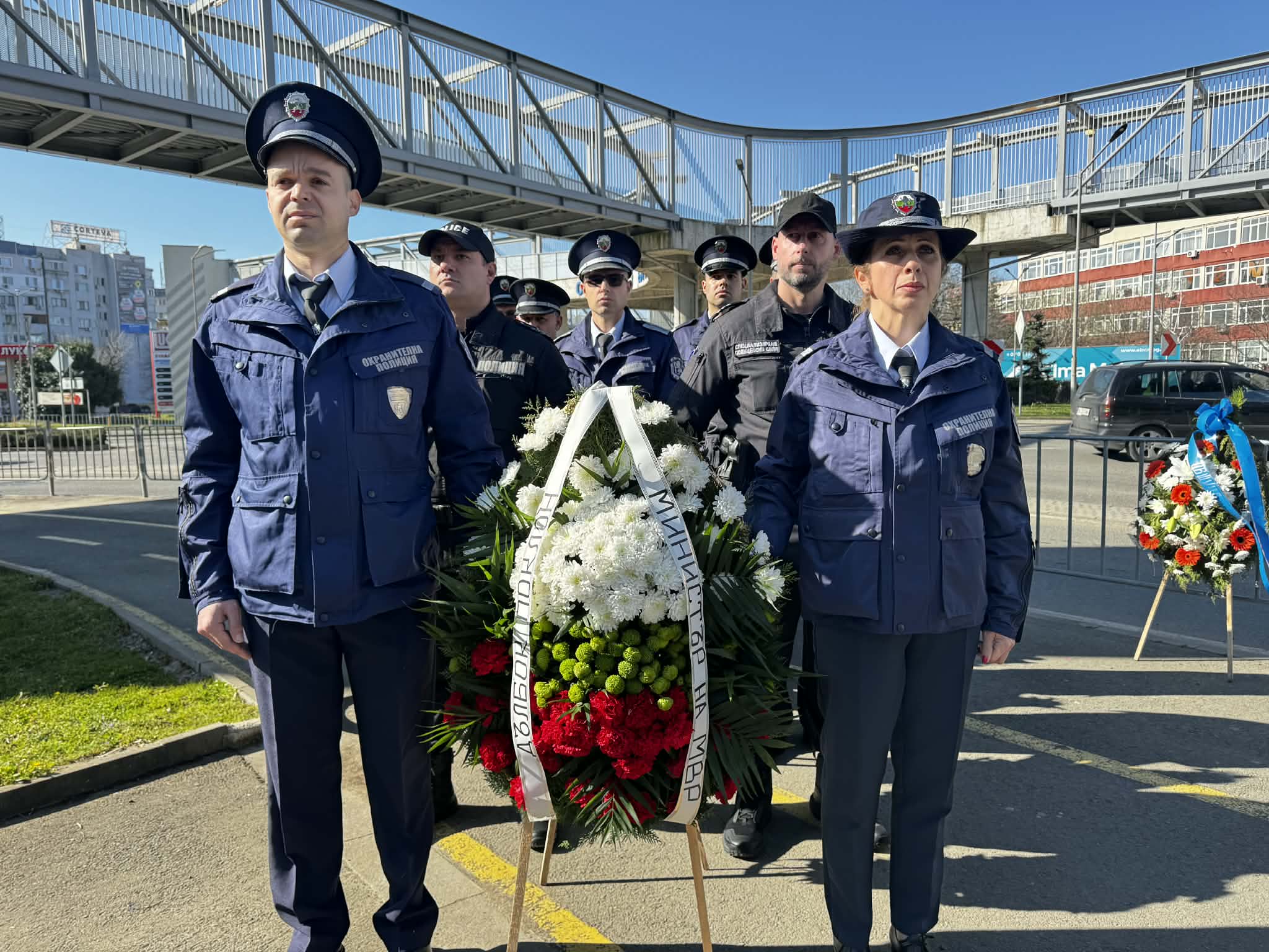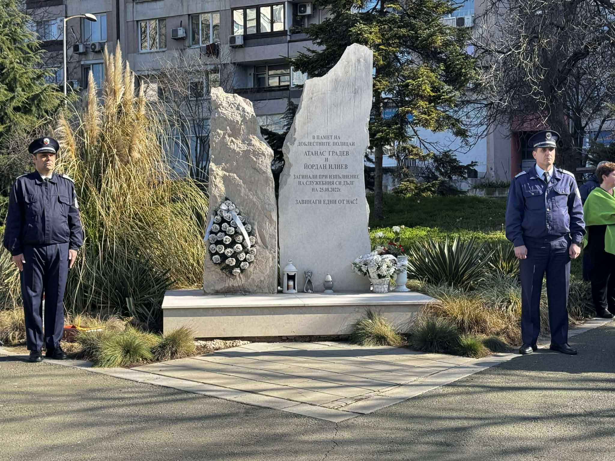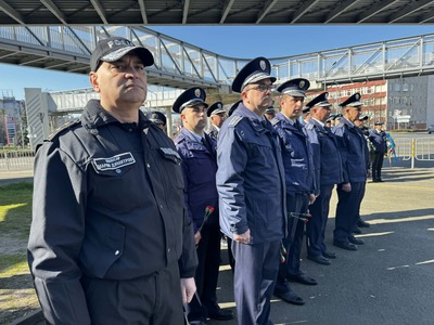Служителите на Областната дирекция на МВР в Бургас, представители на държавната и местната власт и близки на полицаите Йордан Илиев и Атанас Градев, които на 25.08.2022 г. загубиха живота си в опит да спрат нелегален автобус с мигранти, се събраха пред паметника на кръстовище "Трапезица", за да отбележат Международния ден в памет на служителите на реда, загинали при изпълнение на служебния си дълг.