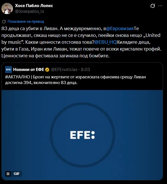 Президентът на испанската обществена телевизия РТВЕ, Хосе-Пабло Лопес, обвини ръководството на фестивала „Евровизия“ в лицемерие заради действията на Израел. Той публикува остър пост в X, с който директно атакува Европейския съюз за радио и телевизия (ЕСРТ): „83 деца убити в Ливан. А в „Евровизия“ продължават да се правят, че все едно нищо не се случва, пеейки „United by Music“ („Обединени от музиката“). Какви ценности защитават там? Хилядите убити деца в Газа, в Иран или в Ливан тежат повече от всеки кристален трофей. Ценностите на фестивала умряха под бомбите.“