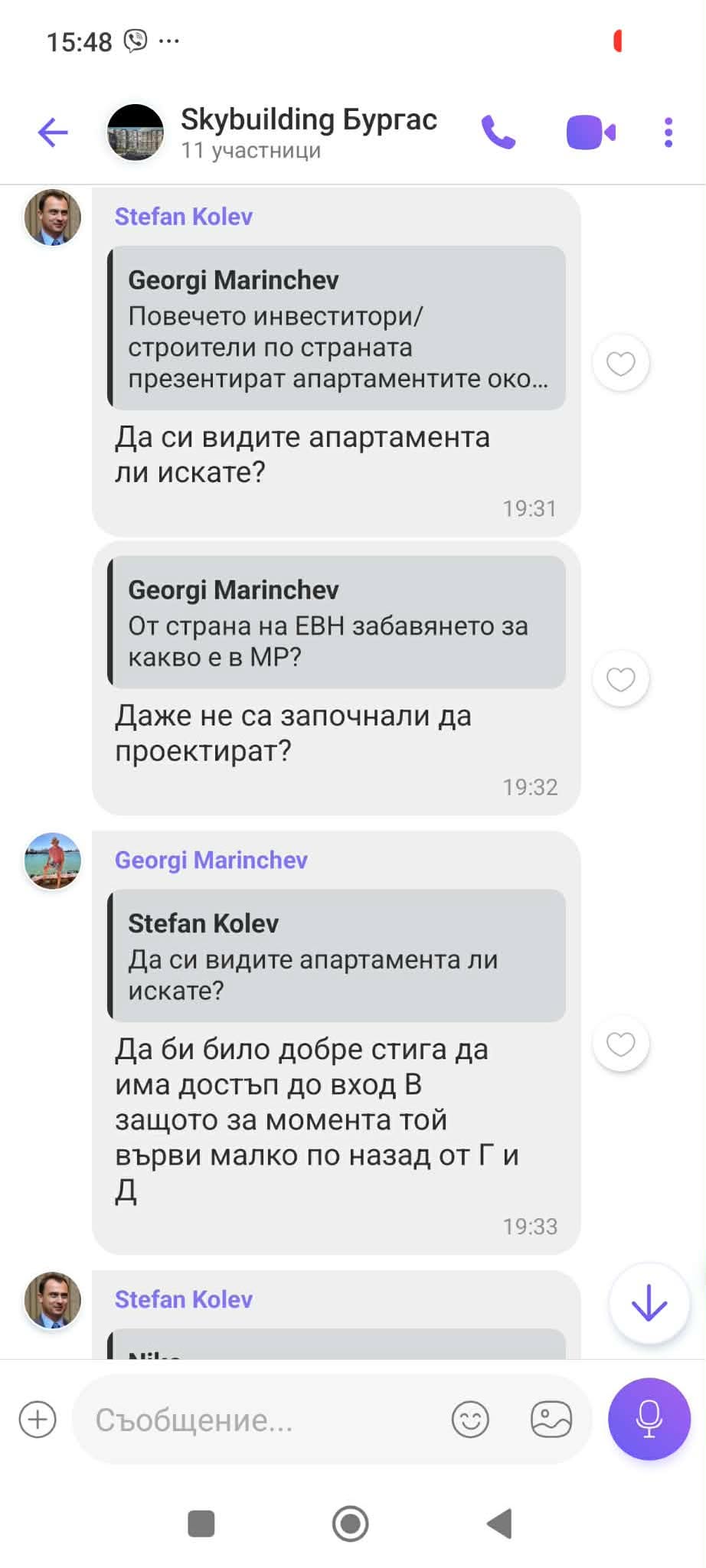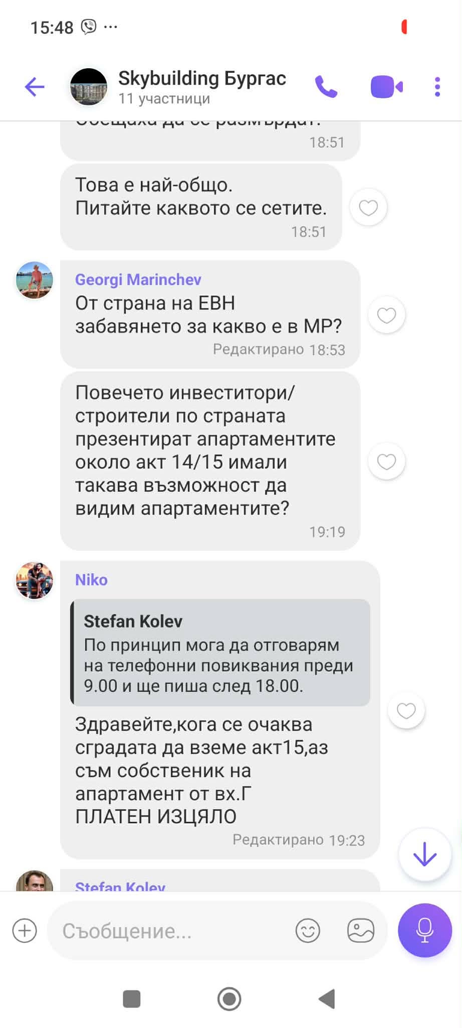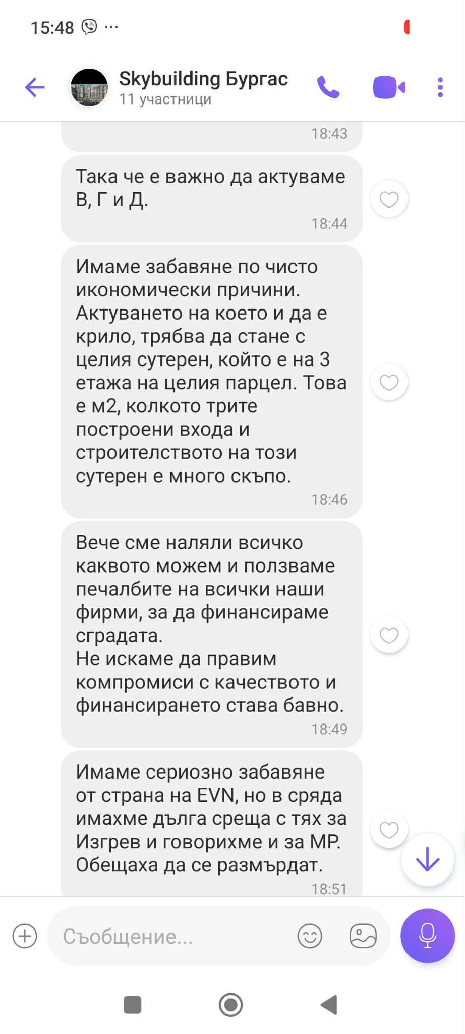 В началото строителят започва да отговаря подробно в чата със „Скайбилдинг“. От написаното става ясно, че входовете В, Г и Д са най-близо до получаване на акт 15. Но колко близо - той не уточнява.