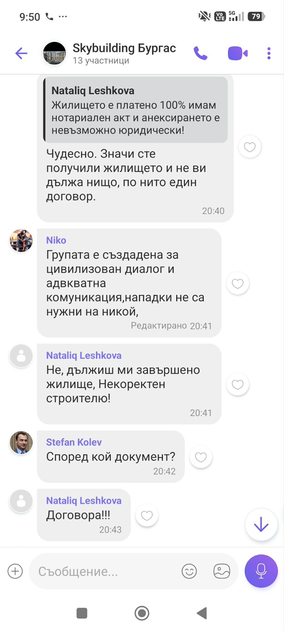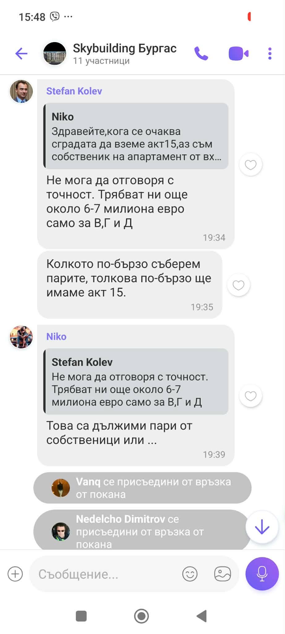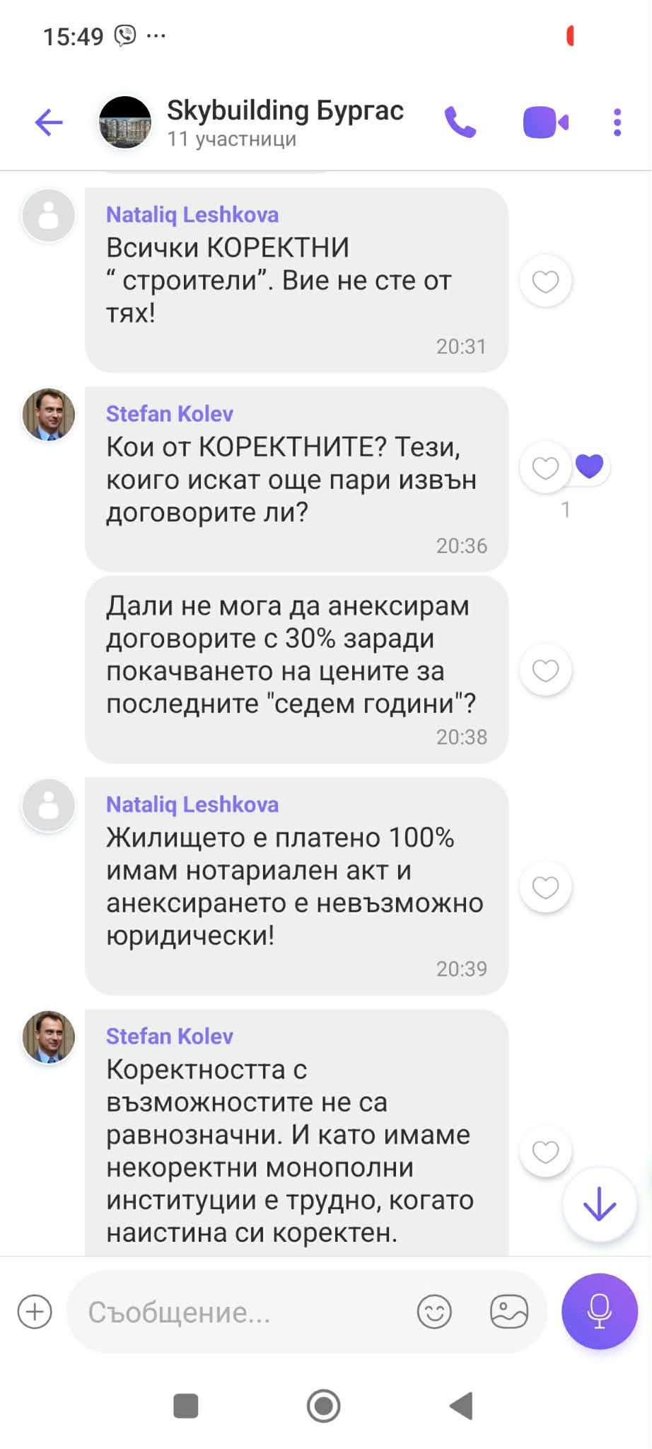 В началото строителят започва да отговаря подробно в чата със „Скайбилдинг“. От написаното става ясно, че входовете В, Г и Д са най-близо до получаване на акт 15. Но колко близо - той не уточнява.