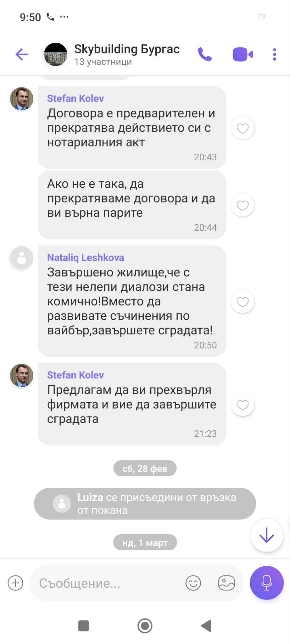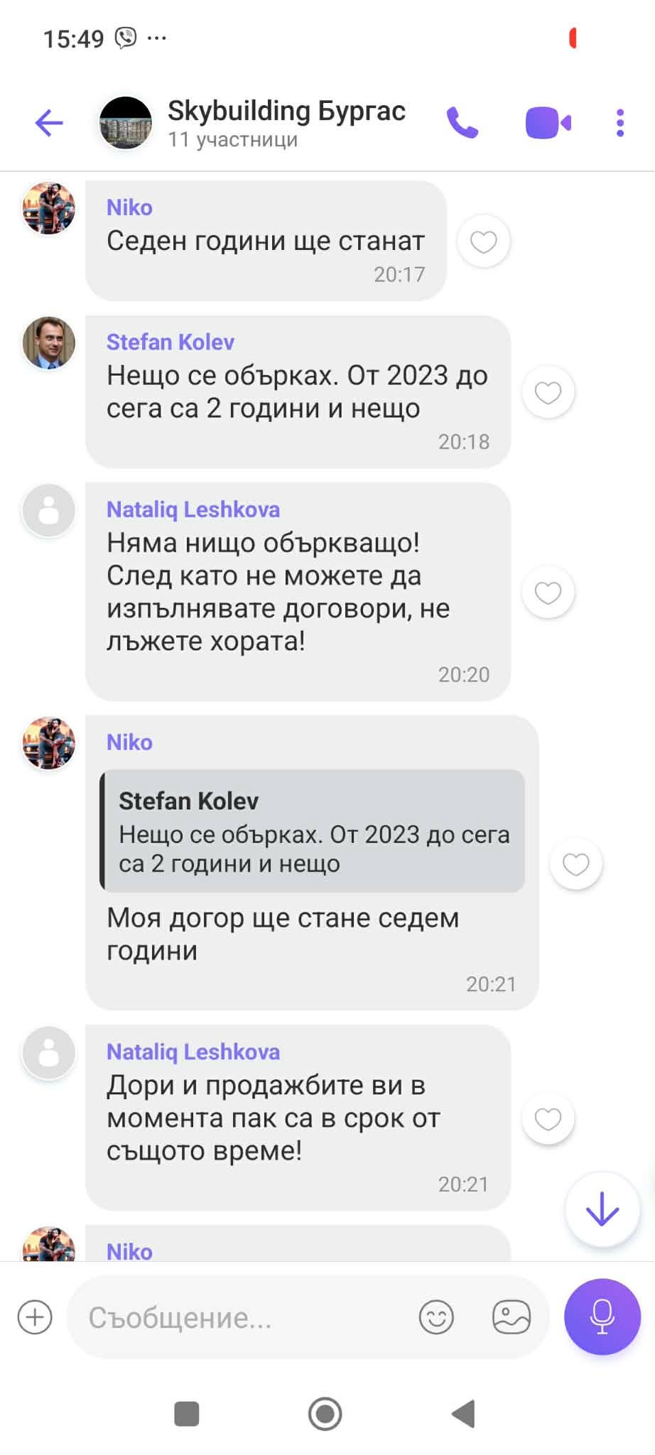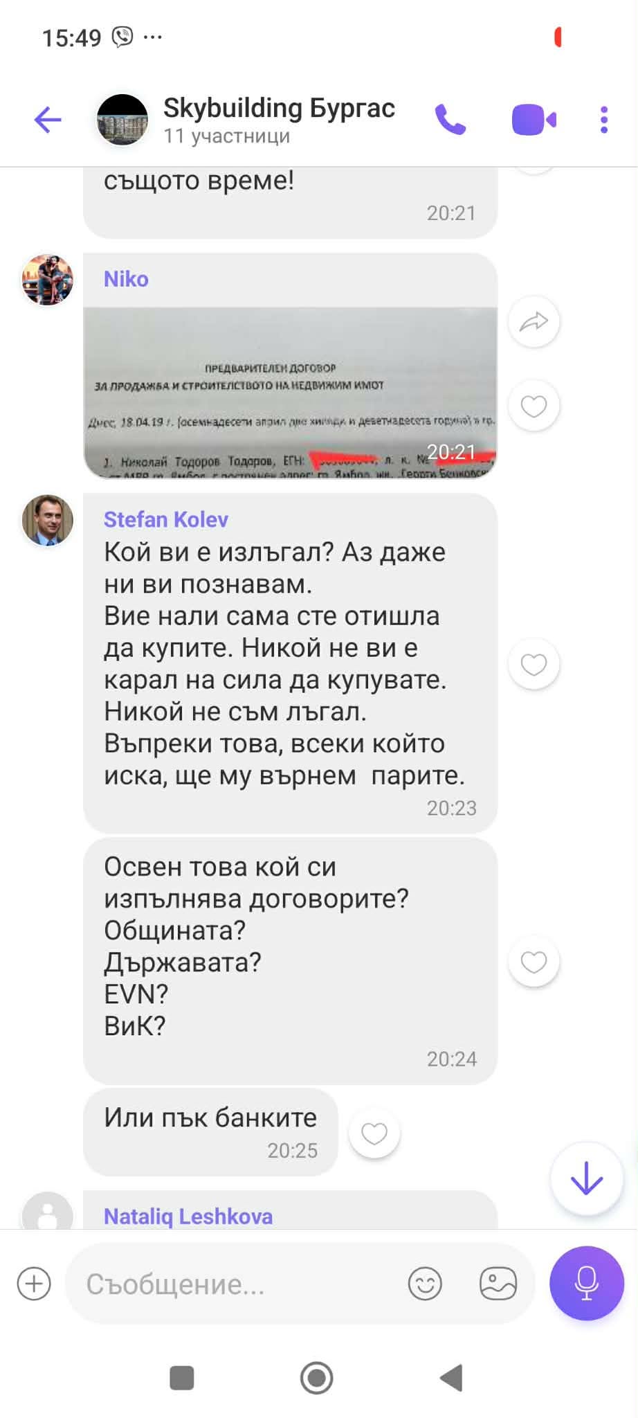 В групата купувачи са посочили, че в договорите си имат срок за строителство от 24 месеца, които отдавна са изтекли. Един от участниците в дискусията обявява, че е сред първите закупили жилища в сградата с предварителен договор - преди повече от 7 години, и до ден-днешен чака строителството да бъде финализирано.