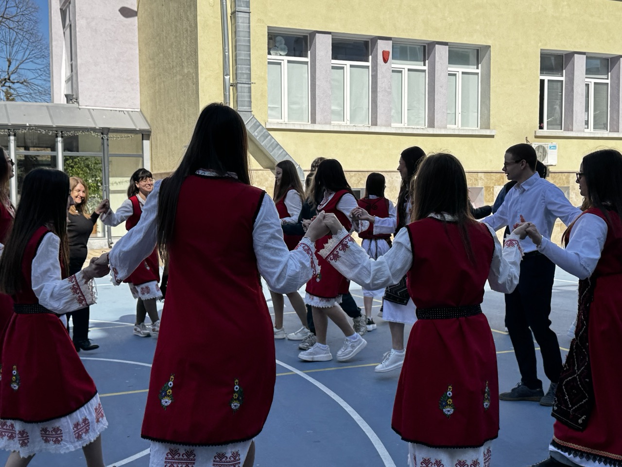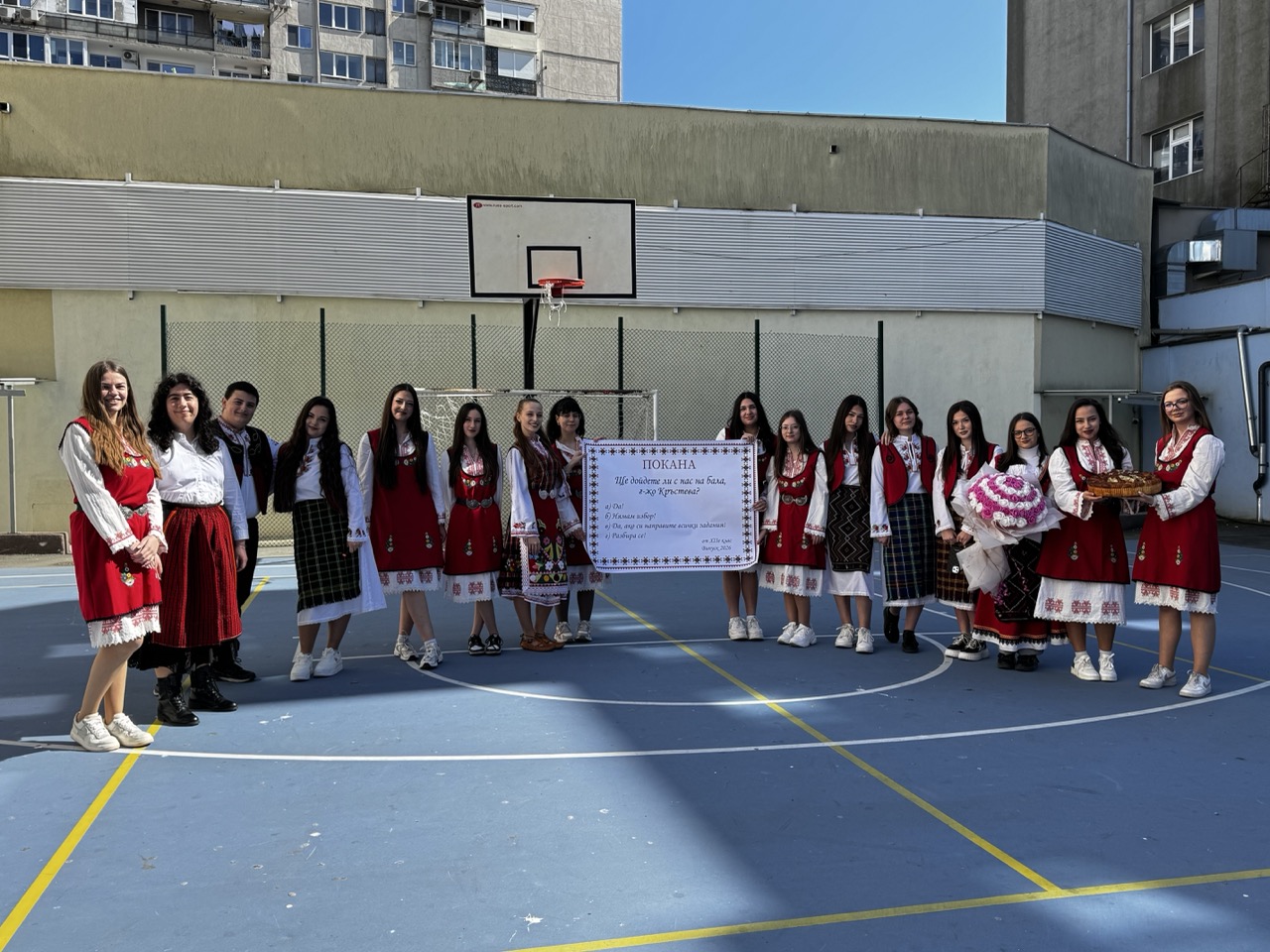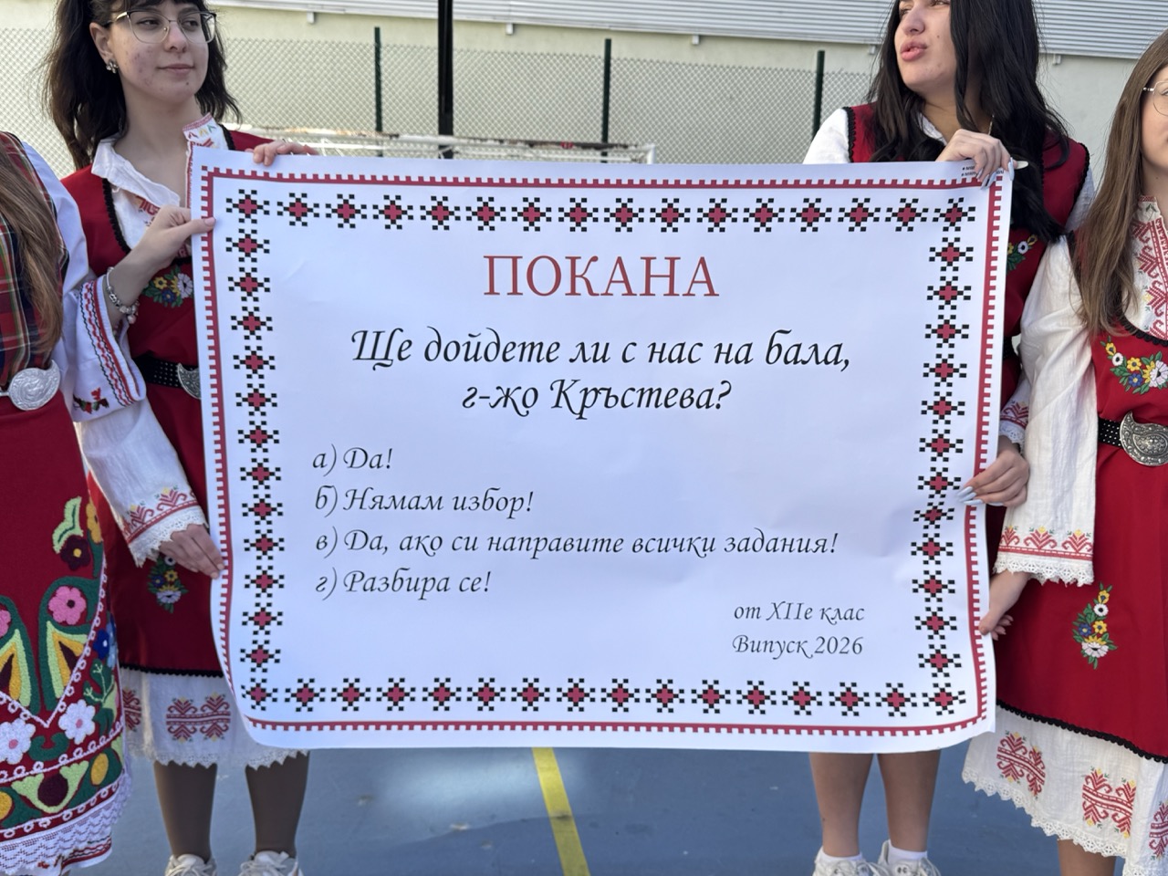 Малко след 12:30 часа бъдещите абитуриенти се събраха в двора на училището, където подготвиха истински малък празник. С голям плакат с надпис „Ще дойдете ли с нас на бала, г-жо Кръстева?“ учениците отправиха своята покана към преподавателката. Атмосферата беше допълнена от звука на гайди и пищно българско хоро, в което се включи целият клас с преподавателят си.