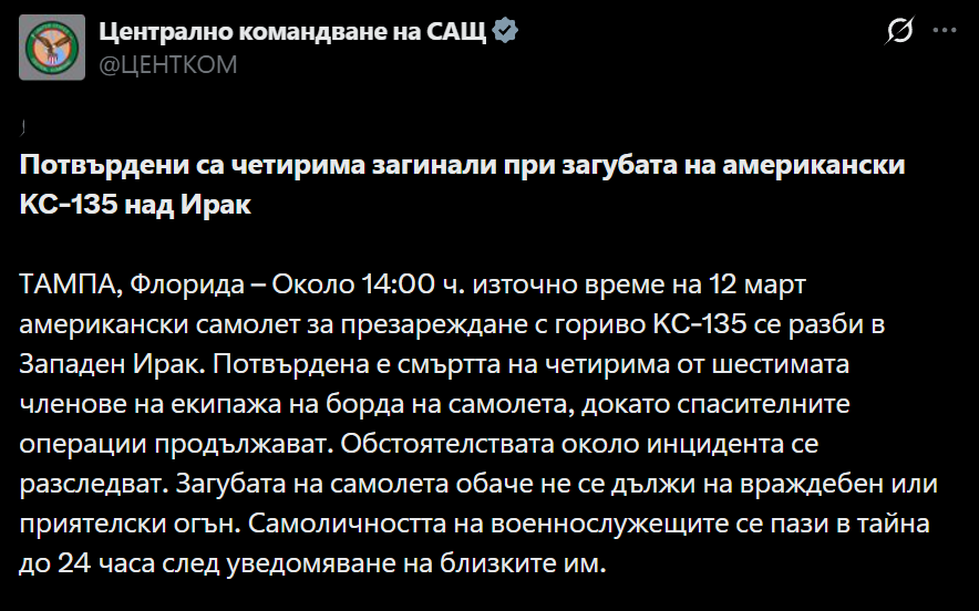 Американски военен самолет за въздушно презареждане „KC-135 Стратотанкер“ се разби по време на мисия в рамките на войната срещу Иран. Четирима души са загинали. Същият тип самолети в момента се намират и на летище „Васил Левски“ в София и станаха повод за разгорещени дебати в Народното събрание. Разбилият се обаче не е излетял от България, става ясно от първоначалните данни. Разследването продължава и е възможно информацията да се промени. Драмата се е разиграла при „приятелски“ инцидент във въздушното пространство на съюзническа държава, съобщи американското Централно командване.