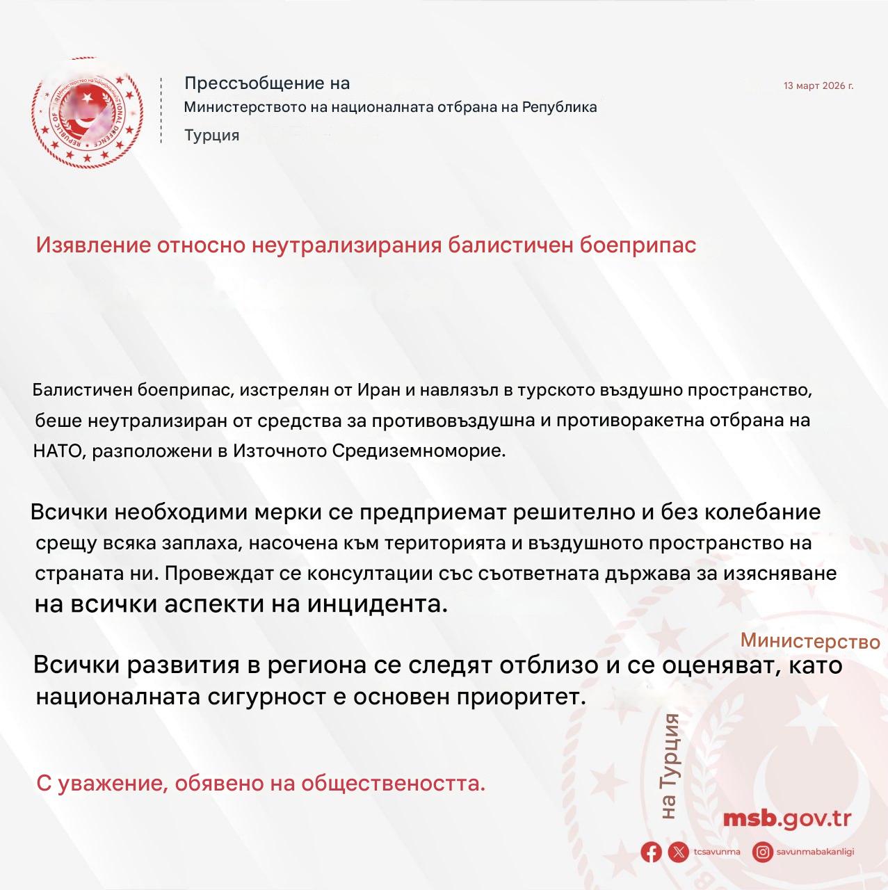 Балистична ракета, изстреляна от Иран и навлязла в турското въздушно пространство, е била унищожена от системи за противоракетна отбрана на НАТО, разположени в Източното Средиземноморие. Това съобщи турското министерство на отбраната.