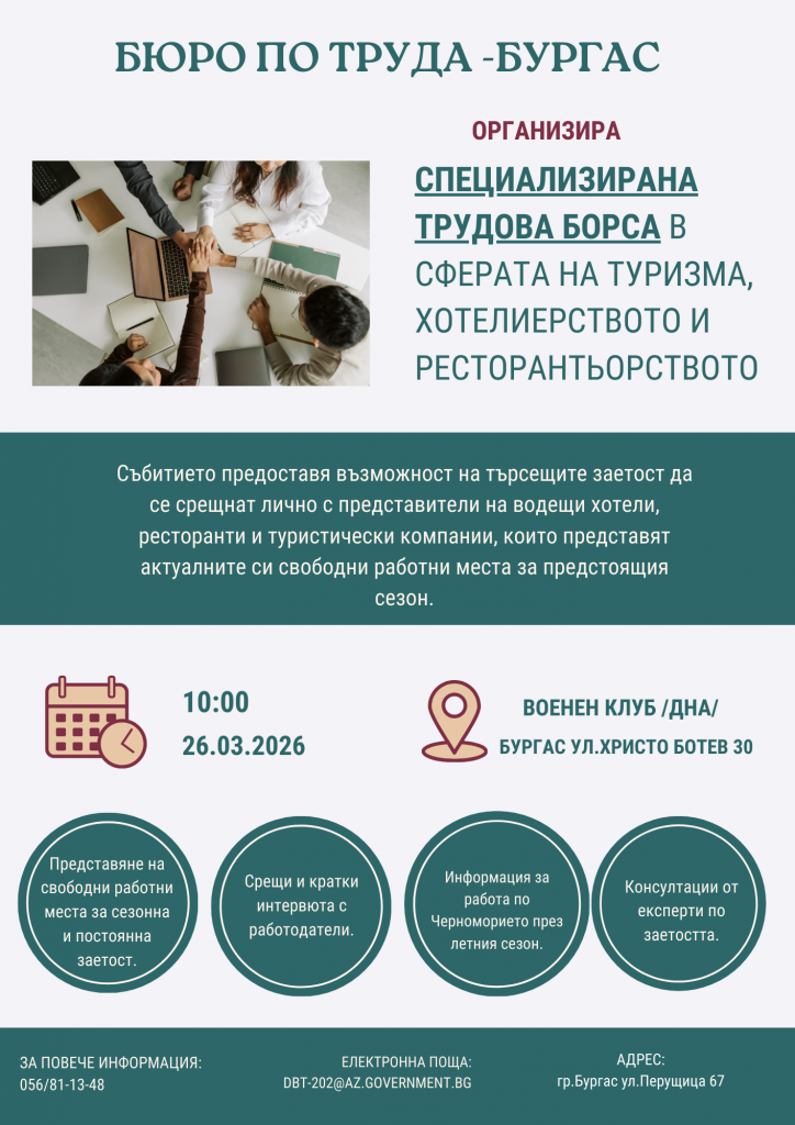 Дирекция „Бюро по труда“ - Бургас, съвместно със Сдружение „Нов път“ и Сдружение „Верният настойник“, организира традиционната специализирана трудова борса в областта на хотелиерството, ресторантьорството и туризма. Събитието ще се проведе на 26 март 2026 г. (четвъртък) от 10.00 часа в Гарнизонния военен клуб на ул. „Христо Ботев“ №30.