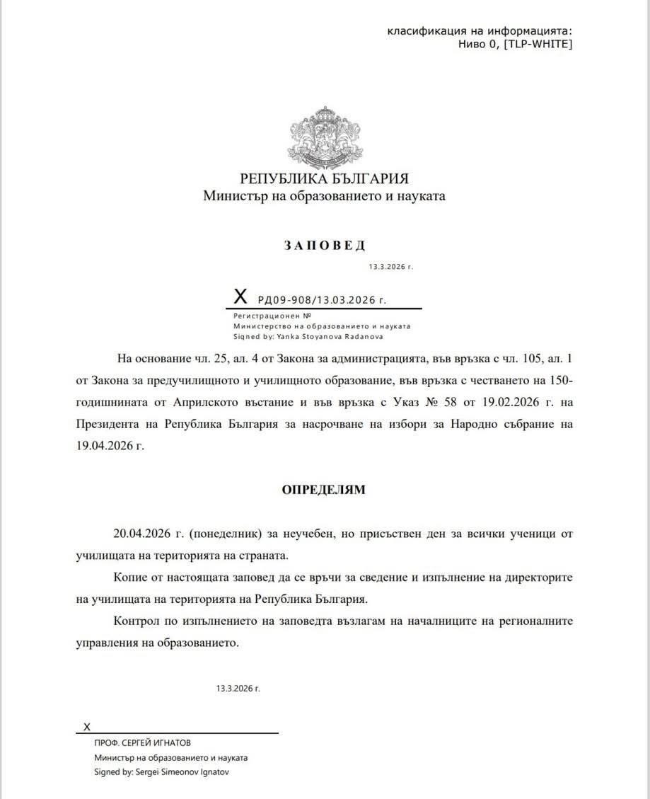 Винаги досега следизборния ден е бил неучебен и неприсъствен, но странна заповед на служебния министър на образованието Сергей Игнатов предизвика сериозно недоволство и сред ученици, и сред родителите им. Образователният министър е обявил 20 април 2026 г. за неучебен, но присъствен ден за всички ученици в страната.