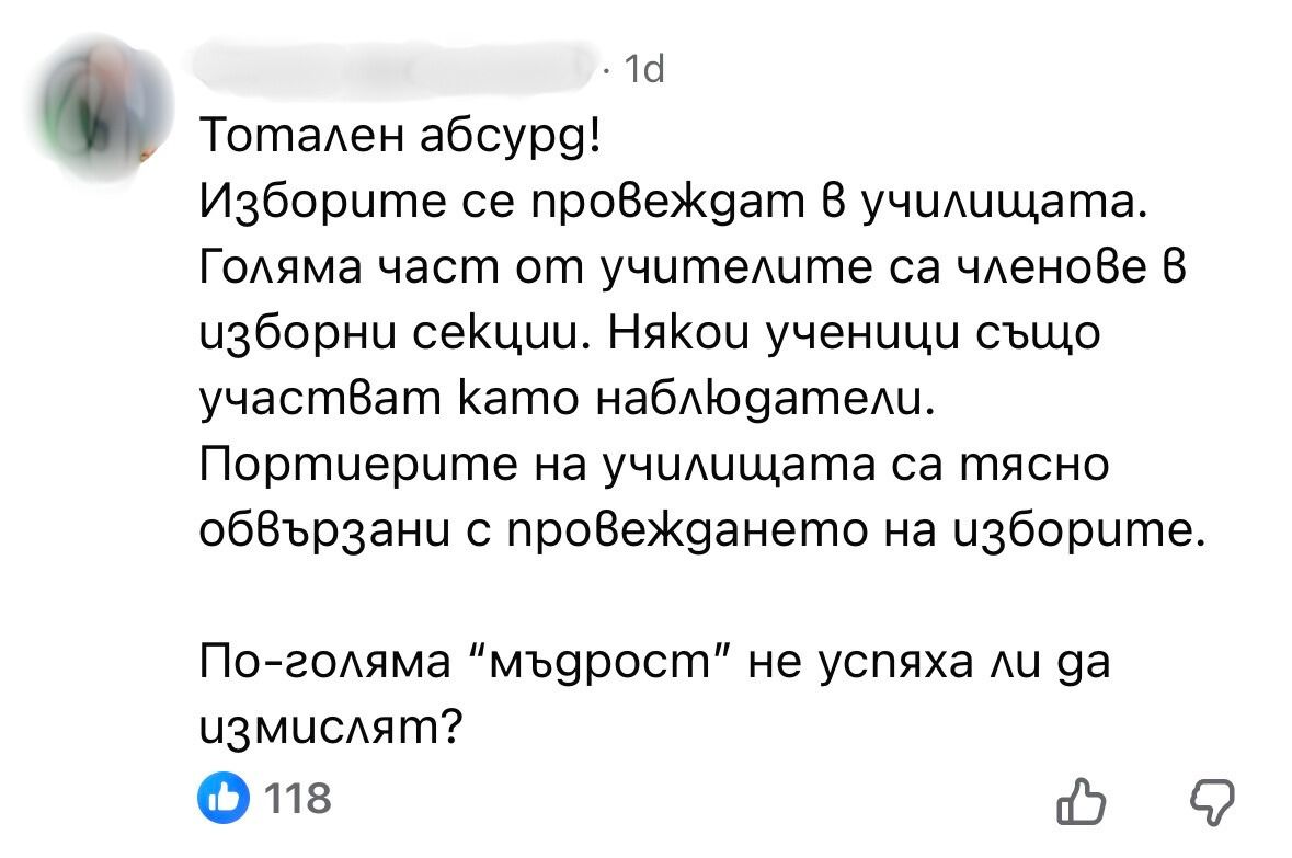 „Тази заповед е неадекватна! Какво ще правят в училище, след като няма да учат, а само ще присъстват?“, коментират родители в социалните мрежи. Други определят решението като „тотален абсурд“, посочвайки, че изборите традиционно се провеждат именно в училищни сгради, което допълнително усложнява ситуацията.