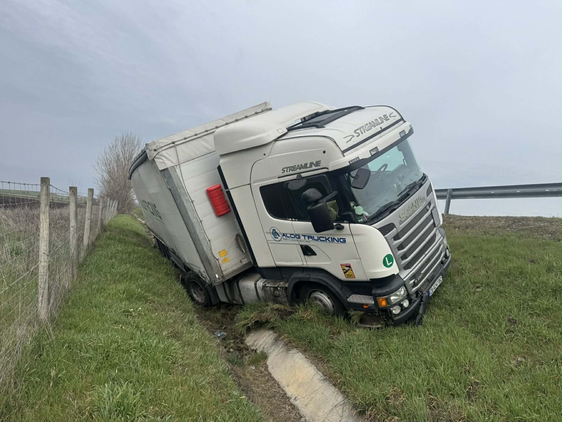 Бял камион, превозващ пратки на известна куриерска фирма, се озова в канавката на АМ "Тракия", след засечка от турски тир. Инцидентът е станал в района на 237 км от аутобана, в посока Бургас.