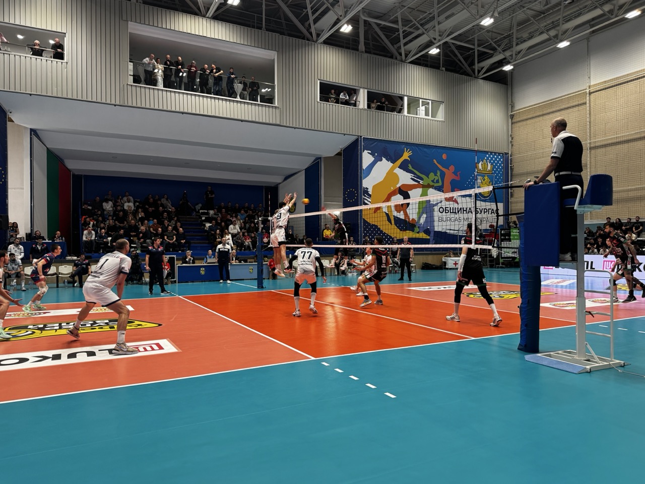 Сред официалните гости на събитието бяха кметът на Бургас Димитър Николов, който има най-големите заслуги за преобразяването на спортната зала. До него са кандидатите за народни представители от ГЕРБ-СДС – водачът на листата Жечо Станков, Галя Василева и Андрей Рунчев. Сред публиката е зам.-кметът по спорт Манол Тодоров, зам.-кметът по финанси Станимир Апостолов, както и зам.-кметът по култура Диана Саватева. Те аплодират играчите заедно с много общински съветници. Присъствието на градските лидери подчертава значимостта на събитието – както за спортната общност, така и за развитието на общината ни.