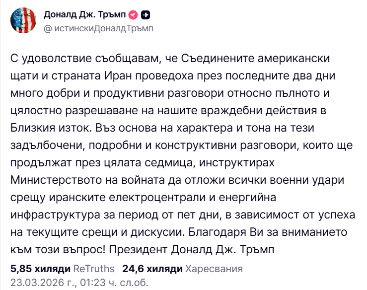 Иранското външно министерство вече опроверга думите на г-н Тръмп, че през последните два дни са били проведени продуктивни преговори, които щели да продължат още цяла седмица: „Отричаме това, което президентът на САЩ Доналд Тръмп каза относно воденето на преговори между Съединените американски щати и Ислямска република Иран. Ислямска република Иран се придържа към позицията си да отхвърля всякакъв вид преговори преди постигането на целите на Иран във войната.“
