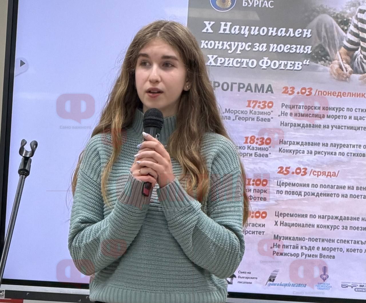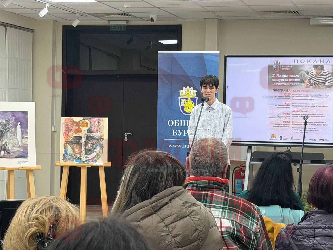 Десетият национален конкурс за поезия „Христо Фотев“ излъчи тази вечер своите първи лауреати – за рецитиране на стихове от творчеството му, както и за рисунка по темата. На първо място журито отличи Атанас Котавов от 9-ти клас на Немската езикова гимназия „Гьоте“ в Бургас.