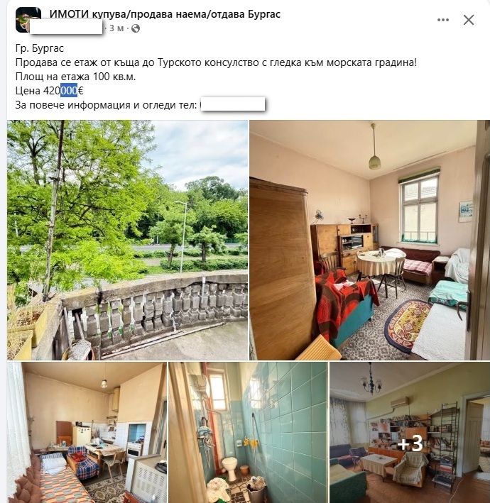 На този фон цените не отстъпват. Независимо, че има все по-предпазливи купувачи на пазара излизат и обяви, които трудно минават теста за реалност. Една от тях предлага етаж от къща в района до Турското консулство - в суперцентъра на Бургас, с площ 100 кв.м и цена... 420 000 евро!