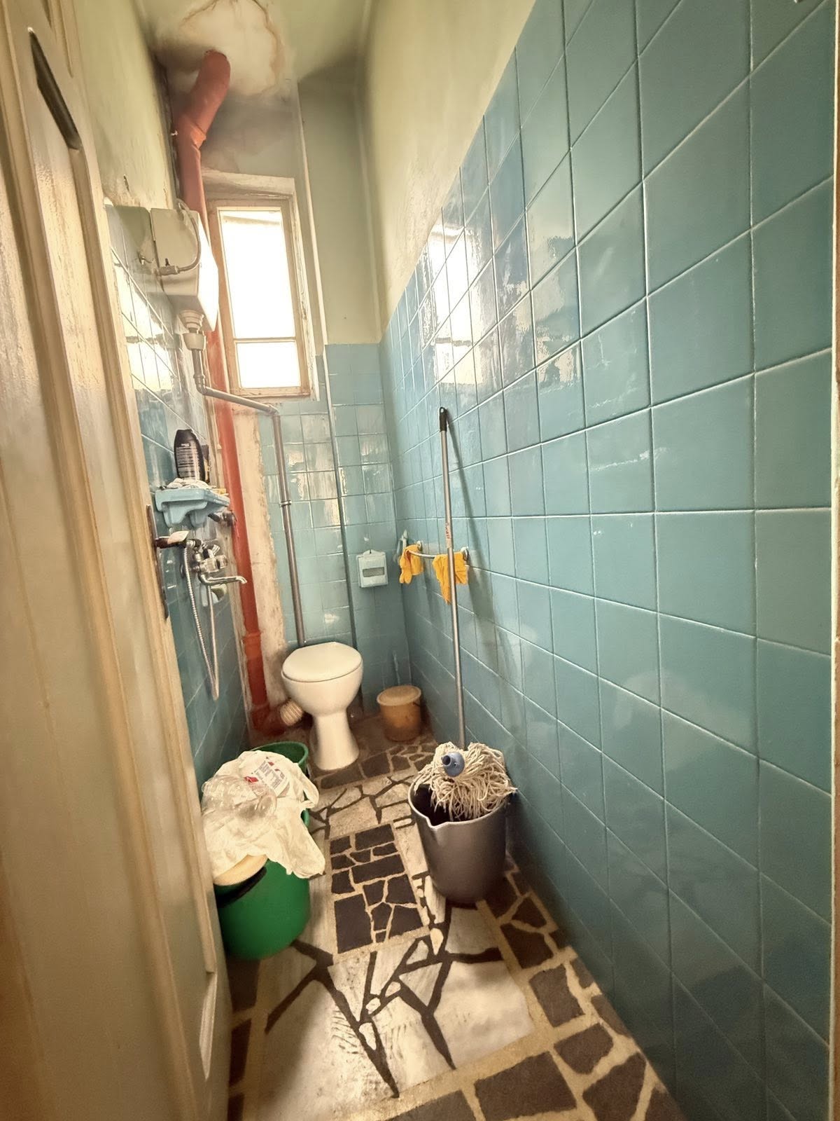 Пространството по-скоро напомня временно обитаван имот с натрупан бит, отколкото адрес от премиум сегмента. Банята и тоалетната също не защитават исканата цена. Помещението е направо абсурдно - тясно, със стар фаянс, видими тръби и базово санитарно оборудване. Там няма нищо, което да доближава стандарта, който пазарът свързва с цена от 4200 евро на квадрат в Бургас.