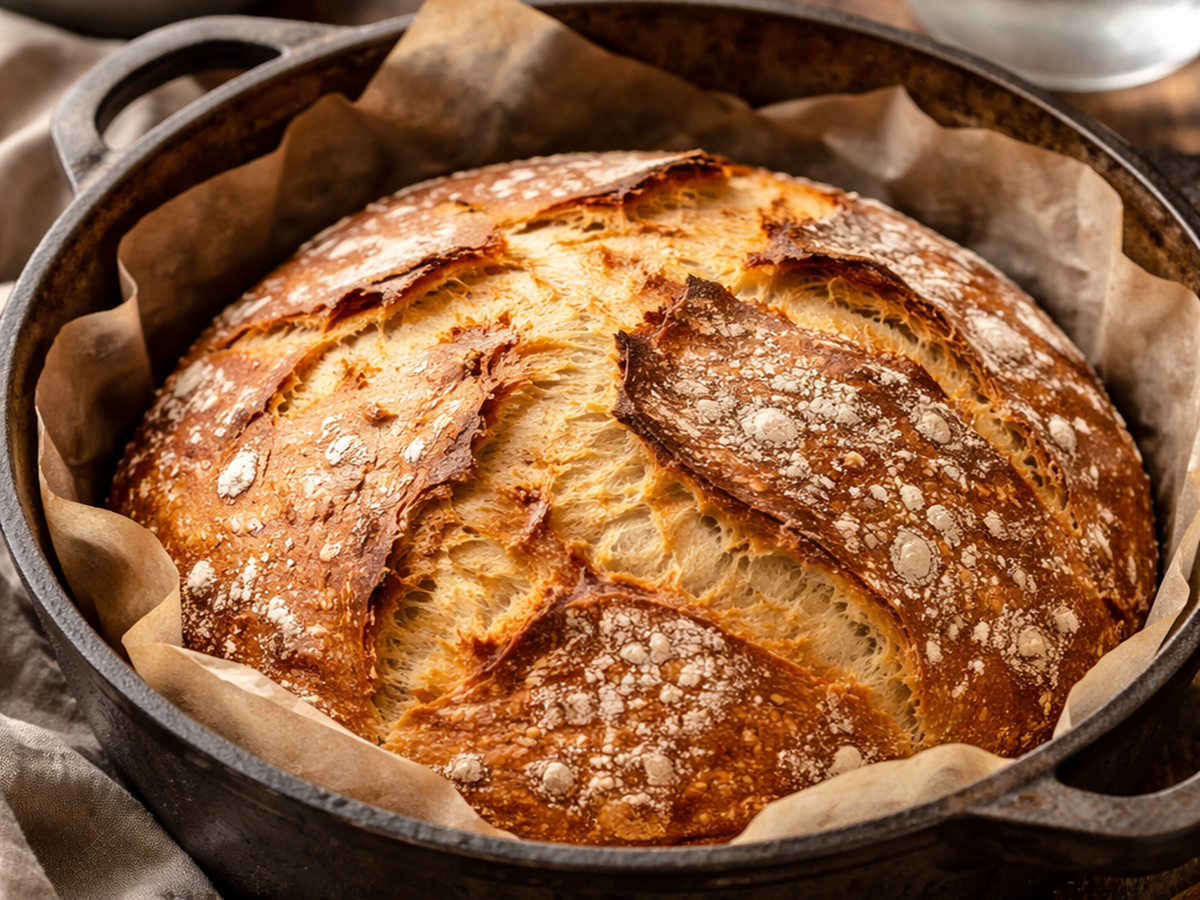 Тази рецепта е особено подходяща за начинаещи, защото не изисква продължително обработване на тестото, нито специални умения. Достатъчно е продуктите да се смесят добре, а останалото до голяма степен се случва почти само. Именно това прави този хляб толкова популярен. Той съчетава семпла подготовка, чудесен вкус и онази апетитна коричка, която всички обичат.