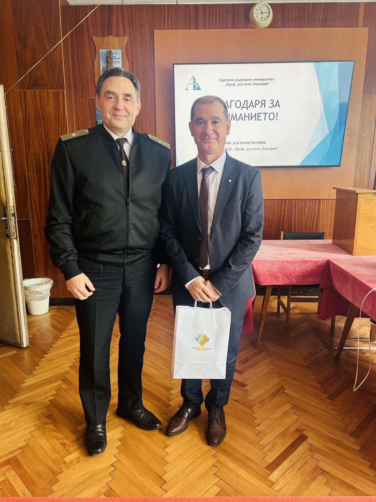 Ректорът на Бургаския държавен университет „Проф. д-р Асен Златаров“ проф. д-р Сотир Сотиров проведе среща с командира на Флотилия бойни и спомагателни кораби, флотилен адмирал Радко Пенев. Срещата беше насочена към установяване на партньорство и развитие на сътрудничеството между университета и Военноморските сили.