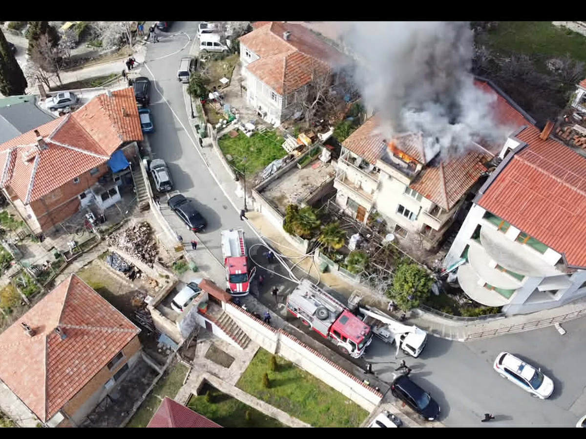 Кадри с дрон на горящата къща вече се разпространяват в мрежата. На мястото на инцидента има полицейски екипи и няколко противопожарни коли. Огнеборците се борят да загасят пламъците от съседната сграда.