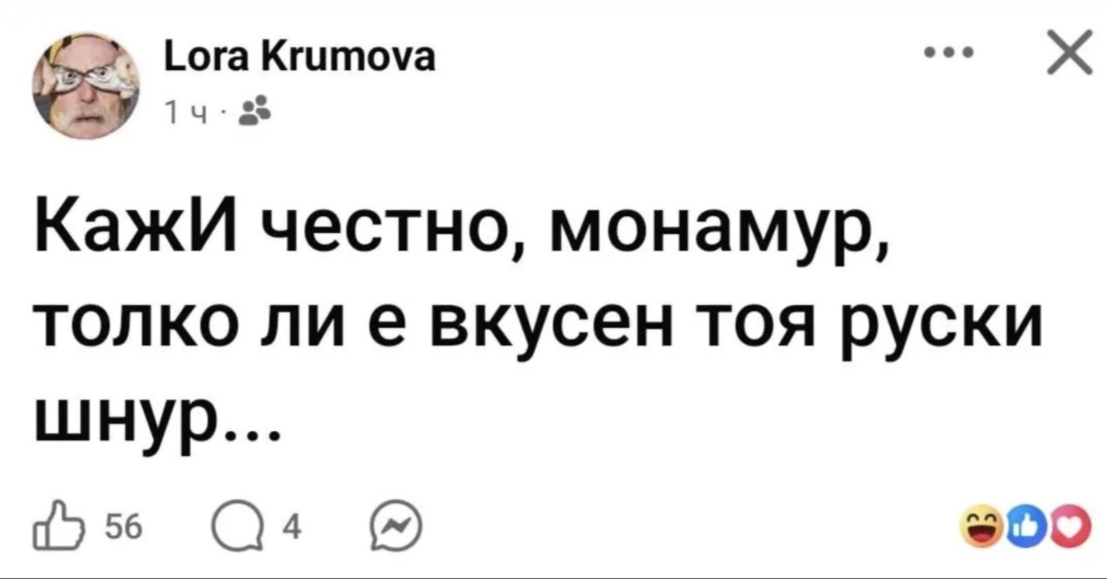 Г-жа Крумова има над 1750 приятели там, което винаги заплашва да превърне и най-съкровено споделеното с тях в национално достояние. „Дори и сред нейните приятели има достойни българи, които споделиха какво мисли за нас Лора Крумова“, написа г-н Костадинов. В краткото куплетче името му липсва, но от неговата публикация се разбира, че се е разпознал в посланието: „КажИ честно, монамур, толко ли е вкусен тоя руски шнур...“
