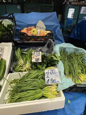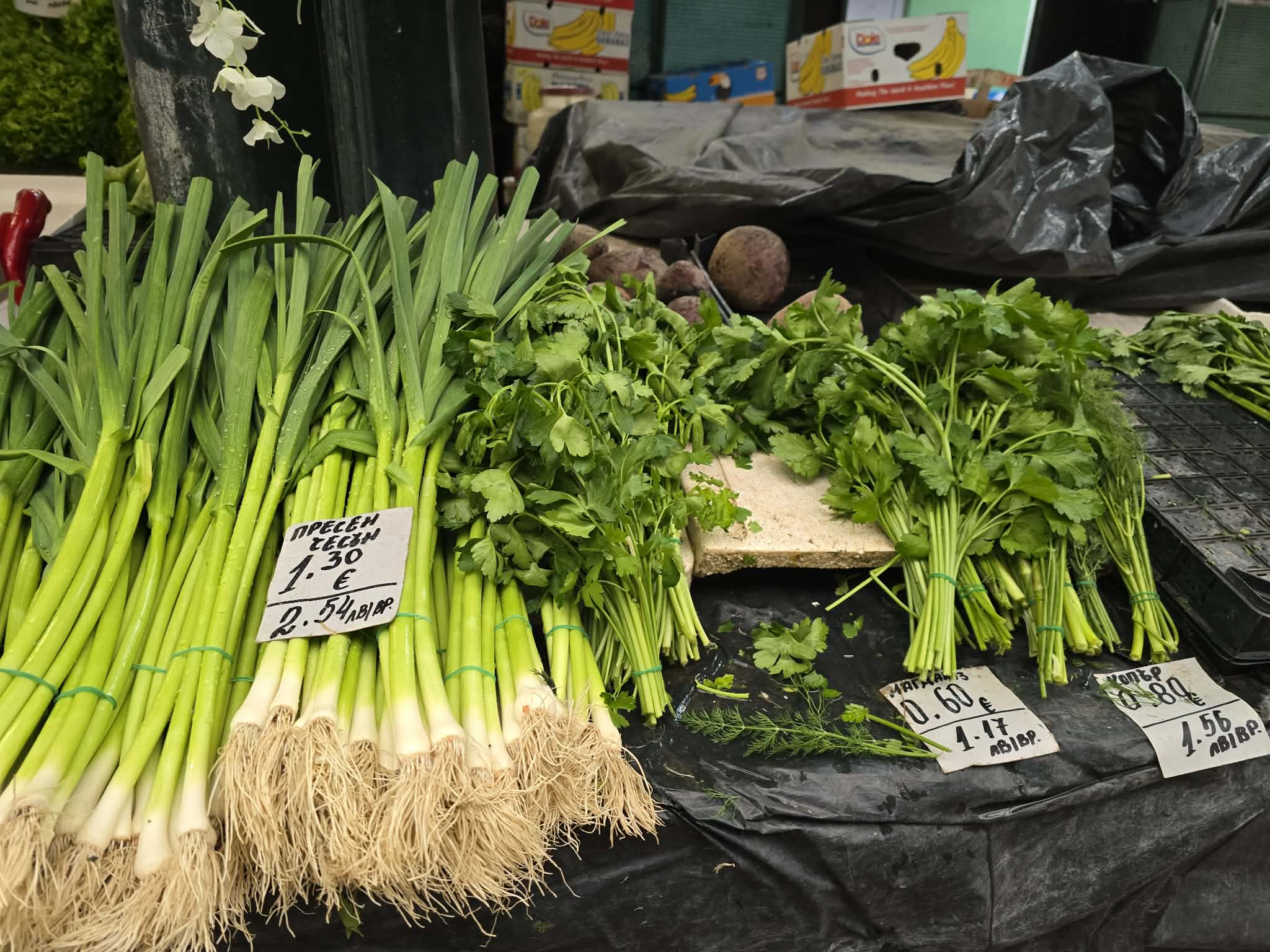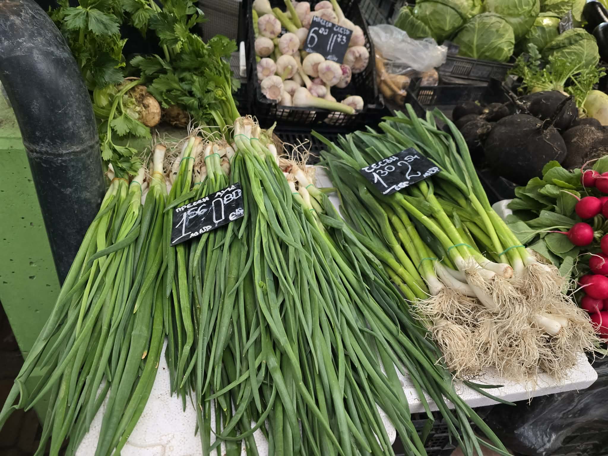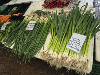 Сезонът на пресните връзки също вече личи ясно по „Краснодар“. Зеленият лук се предлага от 0,80 евро или 1,56 лв. за връзка до 1,30 евро или 2,54 лв. На някои щандове има и комбинирани оферти. Например 3 връзки се продават за 2 евро или 3,90 лв. Пресният чесън също присъства видимо, като цената му е 1,30 евро или 2,54 лв. за връзка.