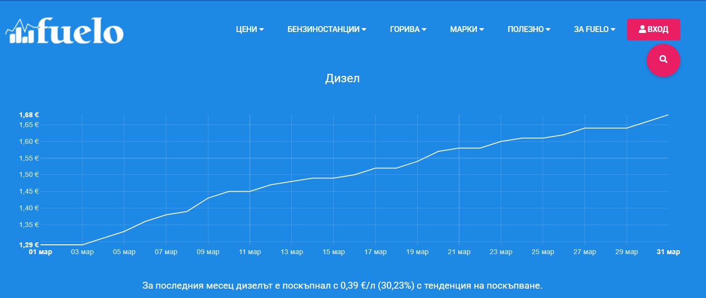 По данни на fuelo.net още в началото на март средната цена на дизела е била значително по-ниска. На 6 март тя е 1,36 евро за литър, а към 26 март вече е 1,62 евро. Това означава рязък скок само в рамките на три седмици, като тенденцията е възходяща и в края на месеца.