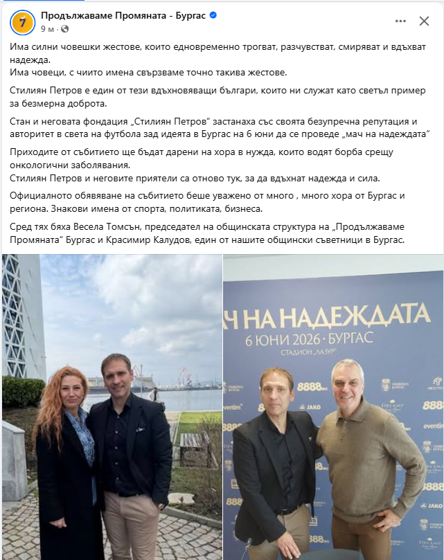 Именно тук стои големият проблем. Брифингът бе за средствата за масова информация и за каузата зад събитието, а не за партийно позициониране, за каквото го използваха двамата от Промяната. Когато двама местни представители на партия се снимат със символ на обществено доверие като Стилиян Петров, а после кадрите попадат в официалната партийна страница в разгара на предизборна кампания, прочитът е ясен. Целта изглежда не подкрепа за каузата, а опит за преливане на общественото уважение към Стенли в партийна полза.