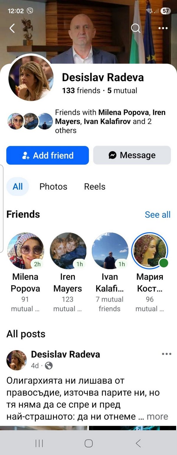 На въпросната страница във фейсбук името на бившата първа дама е в мъжки род - Desislav, но пък профилната снимка си е нейна. Фотографията на корицата е на президента Радев. Прави впечатление, че фалшивият профил функционира от края на февруари, а постовете, които се публикуват, са от предизборните обиколки на "Прогресивна България" и на практика представляват реклама на Румен Радев.