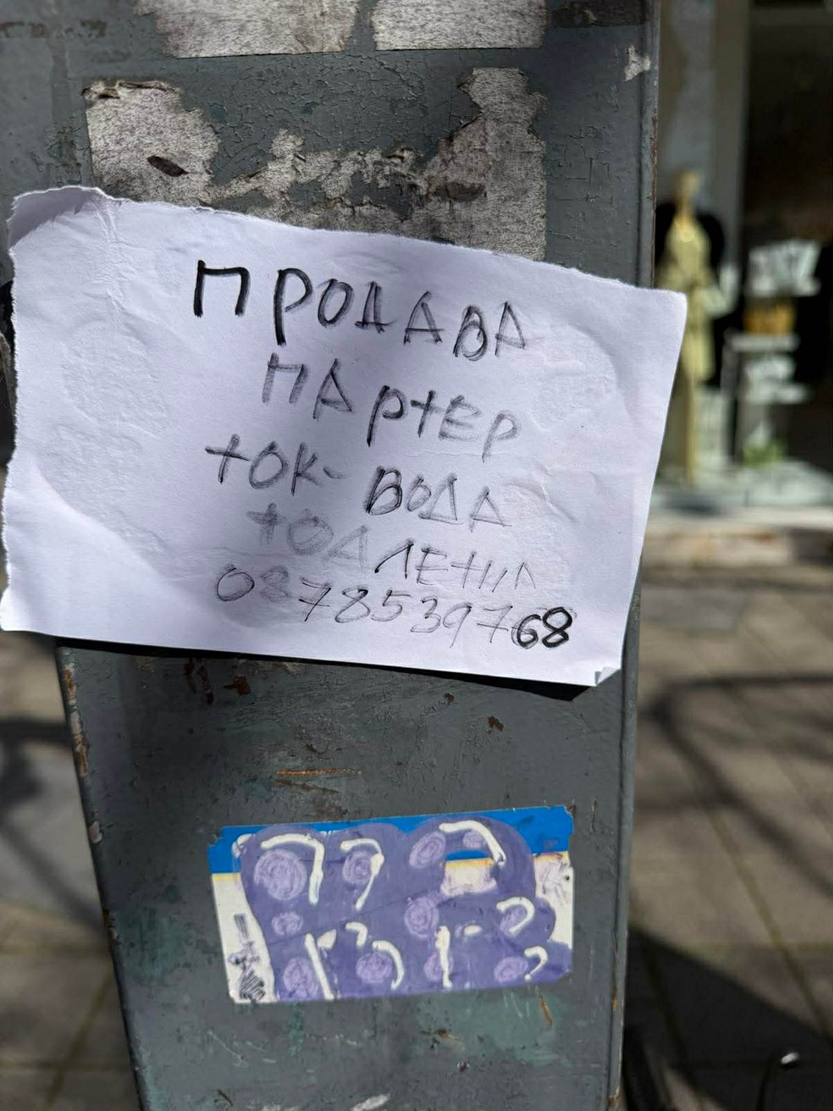 Всички, буквално всички, стълбове на уличното осветление в ЦГЧ са налепени перманентно с ето този текст: "Продам партер - ток, вода, тоалетна", тел. ..."